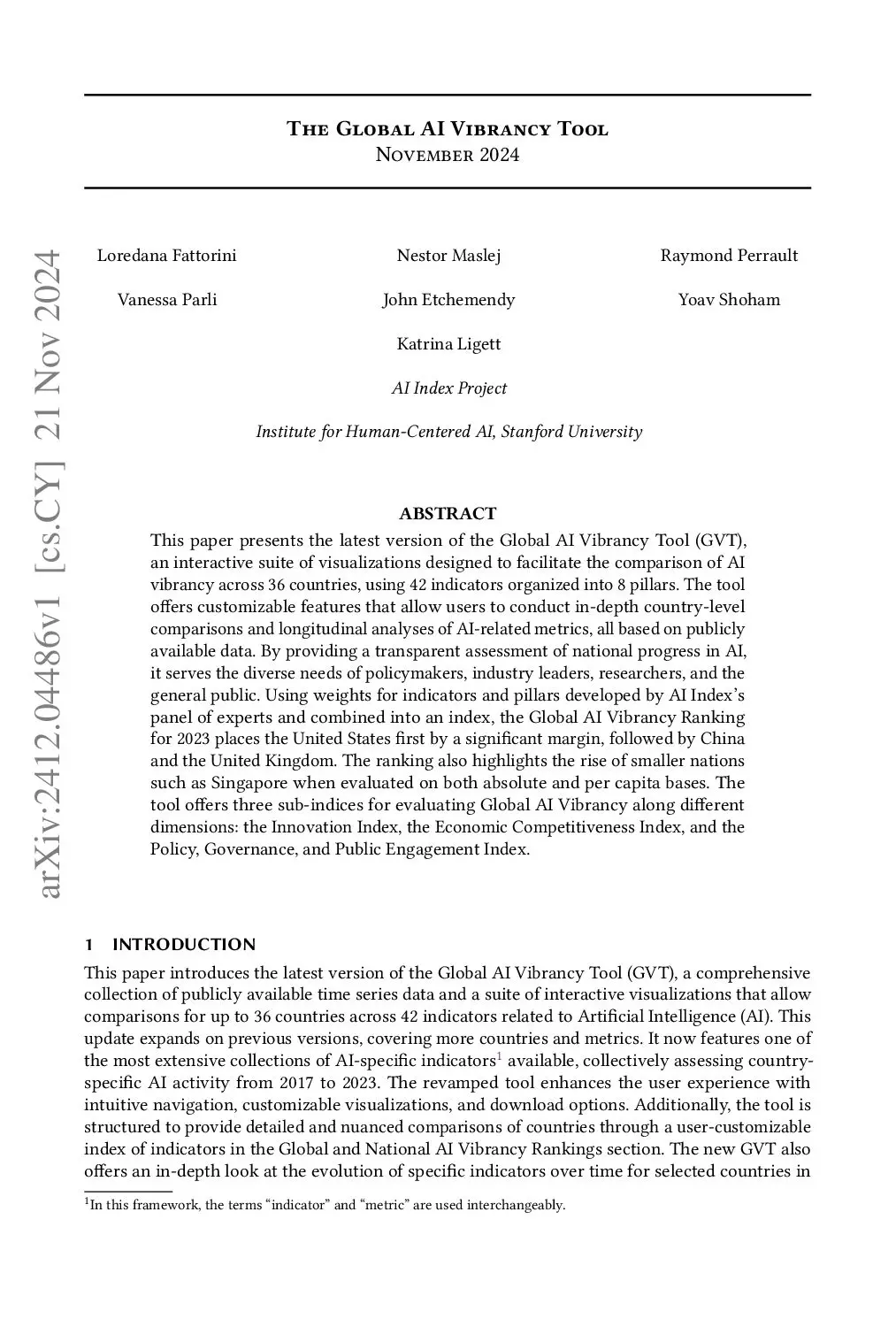 This paper presents the latest version of the Global AI Vibrancy Tool (GVT), an interactive suite of visualizations designed to facilitate the comparison of AI vibrancy across 36 countries, using 42 indicators organized into 8 pillars. The tool offers customizable features that allow users to conduct in-depth country-level comparisons and longitudinal analyses of AI-related metrics, all based on publicly available data. By providing a transparent assessment of national progress in AI, it serves the diverse needs of policymakers, industry leaders, researchers, and the general public. Using weights for indicators and pillars developed by AI Index's panel of experts and combined into an index, the Global AI Vibrancy Ranking for 2023 places the United States first by a significant margin, followed by China and the United Kingdom. The ranking also highlights the rise of smaller nations such as Singapore when evaluated on both absolute and per capita bases. The tool offers three sub-indices for evaluating Global AI Vibrancy along different dimensions: the Innovation Index, the Economic Competitiveness Index, and the Policy, Governance, and Public Engagement Index.