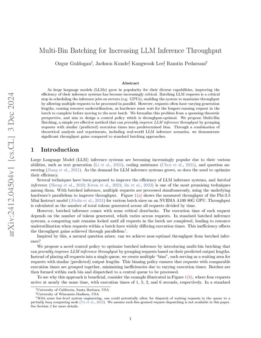 As large language models (LLMs) grow in popularity for their diverse capabilities, improving the efficiency of their inference systems has become increasingly critical. Batching LLM requests is a critical step in scheduling the inference jobs on servers (e.g. GPUs), enabling the system to maximize throughput by allowing multiple requests to be processed in parallel. However, requests often have varying generation lengths, causing resource underutilization, as hardware must wait for the longest-running request in the batch to complete before moving to the next batch. We formalize this problem from a queueing-theoretic perspective, and aim to design a control policy which is throughput-optimal. We propose Multi-Bin Batching, a simple yet effective method that can provably improve LLM inference throughput by grouping requests with similar (predicted) execution times into predetermined bins. Through a combination of theoretical analysis and experiments, including real-world LLM inference scenarios, we demonstrate significant throughput gains compared to standard batching approaches.