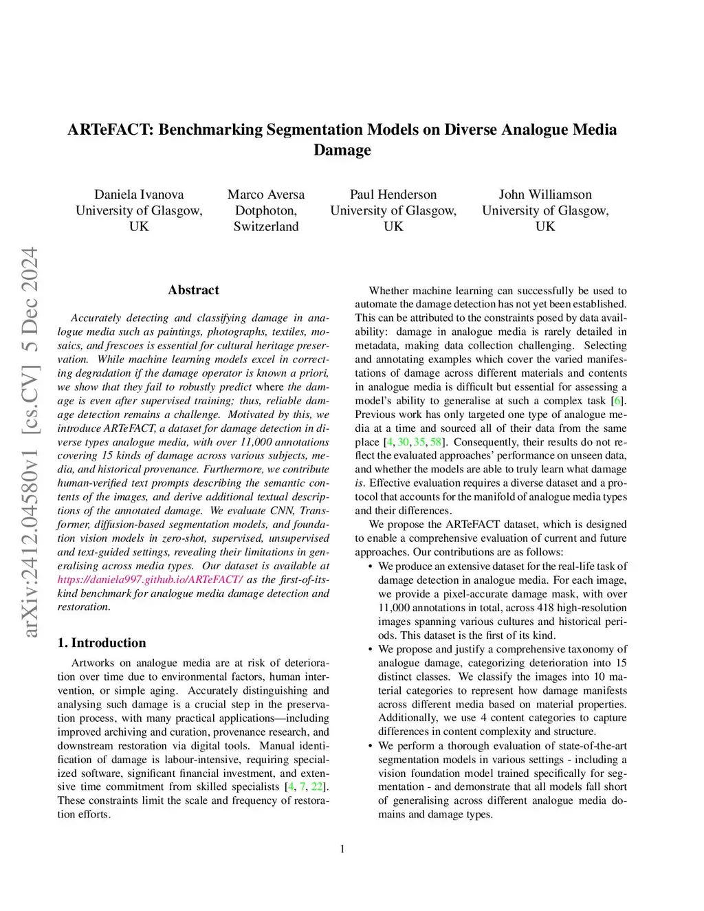 Accurately detecting and classifying damage in analogue media such as paintings, photographs, textiles, mosaics, and frescoes is essential for cultural heritage preservation. While machine learning models excel in correcting degradation if the damage operator is known a priori, we show that they fail to robustly predict where the damage is even after supervised training; thus, reliable damage detection remains a challenge. Motivated by this, we introduce ARTeFACT, a dataset for damage detection in diverse types analogue media, with over 11,000 annotations covering 15 kinds of damage across various subjects, media, and historical provenance. Furthermore, we contribute human-verified text prompts describing the semantic contents of the images, and derive additional textual descriptions of the annotated damage. We evaluate CNN, Transformer, diffusion-based segmentation models, and foundation vision models in zero-shot, supervised, unsupervised and text-guided settings, revealing their limitations in generalising across media types. Our dataset is available at as the first-of-its-kind benchmark for analogue media damage detection and restoration.