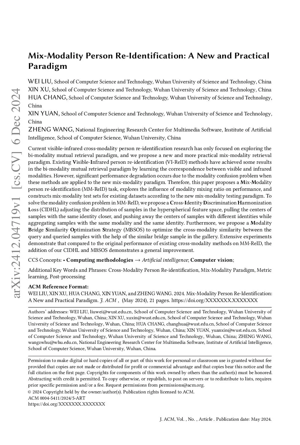 Current visible-infrared cross-modality person re-identification research has only focused on exploring the bi-modality mutual retrieval paradigm, and we propose a new and more practical mix-modality retrieval paradigm. Existing Visible-Infrared person re-identification (VI-ReID) methods have achieved some results in the bi-modality mutual retrieval paradigm by learning the correspondence between visible and infrared modalities. However, significant performance degradation occurs due to the modality confusion problem when these methods are applied to the new mix-modality paradigm. Therefore, this paper proposes a Mix-Modality person re-identification (MM-ReID) task, explores the influence of modality mixing ratio on performance, and constructs mix-modality test sets for existing datasets according to the new mix-modality testing paradigm. To solve the modality confusion problem in MM-ReID, we propose a Cross-Identity Discrimination Harmonization Loss (CIDHL) adjusting the distribution of samples in the hyperspherical feature space, pulling the centers of samples with the same identity closer, and pushing away the centers of samples with different identities while aggregating samples with the same modality and the same identity. Furthermore, we propose a Modality Bridge Similarity Optimization Strategy (MBSOS) to optimize the cross-modality similarity between the query and queried samples with the help of the similar bridge sample in the gallery. Extensive experiments demonstrate that compared to the original performance of existing cross-modality methods on MM-ReID, the addition of our CIDHL and MBSOS demonstrates a general improvement.