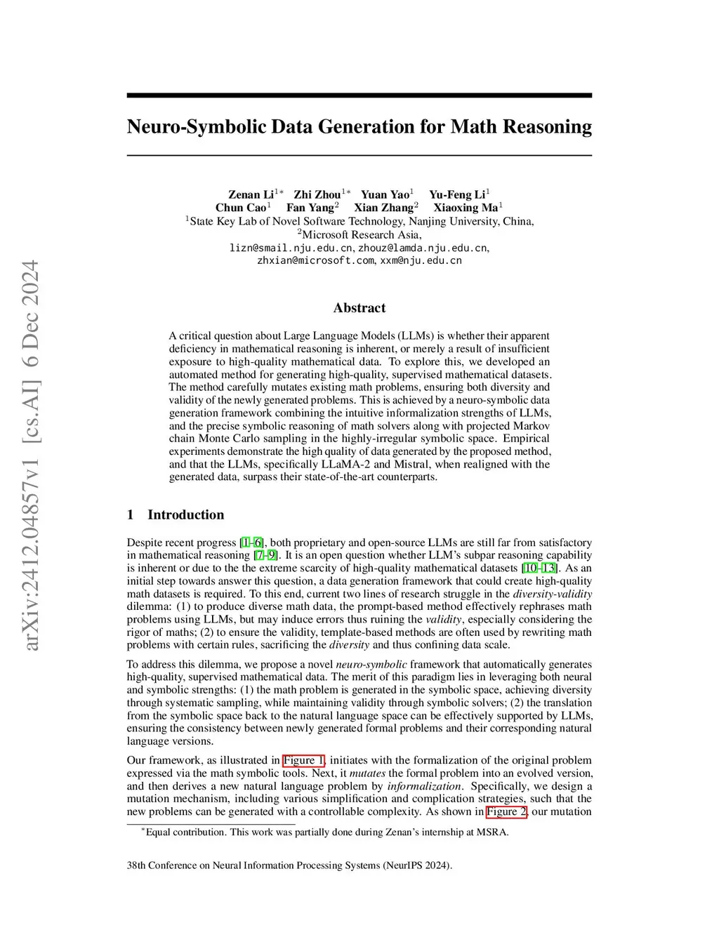 A critical question about Large Language Models (LLMs) is whether their apparent deficiency in mathematical reasoning is inherent, or merely a result of insufficient exposure to high-quality mathematical data. To explore this, we developed an automated method for generating high-quality, supervised mathematical datasets. The method carefully mutates existing math problems, ensuring both diversity and validity of the newly generated problems. This is achieved by a neuro-symbolic data generation framework combining the intuitive informalization strengths of LLMs, and the precise symbolic reasoning of math solvers along with projected Markov chain Monte Carlo sampling in the highly-irregular symbolic space. Empirical experiments demonstrate the high quality of data generated by the proposed method, and that the LLMs, specifically LLaMA-2 and Mistral, when realigned with the generated data, surpass their state-of-the-art counterparts.