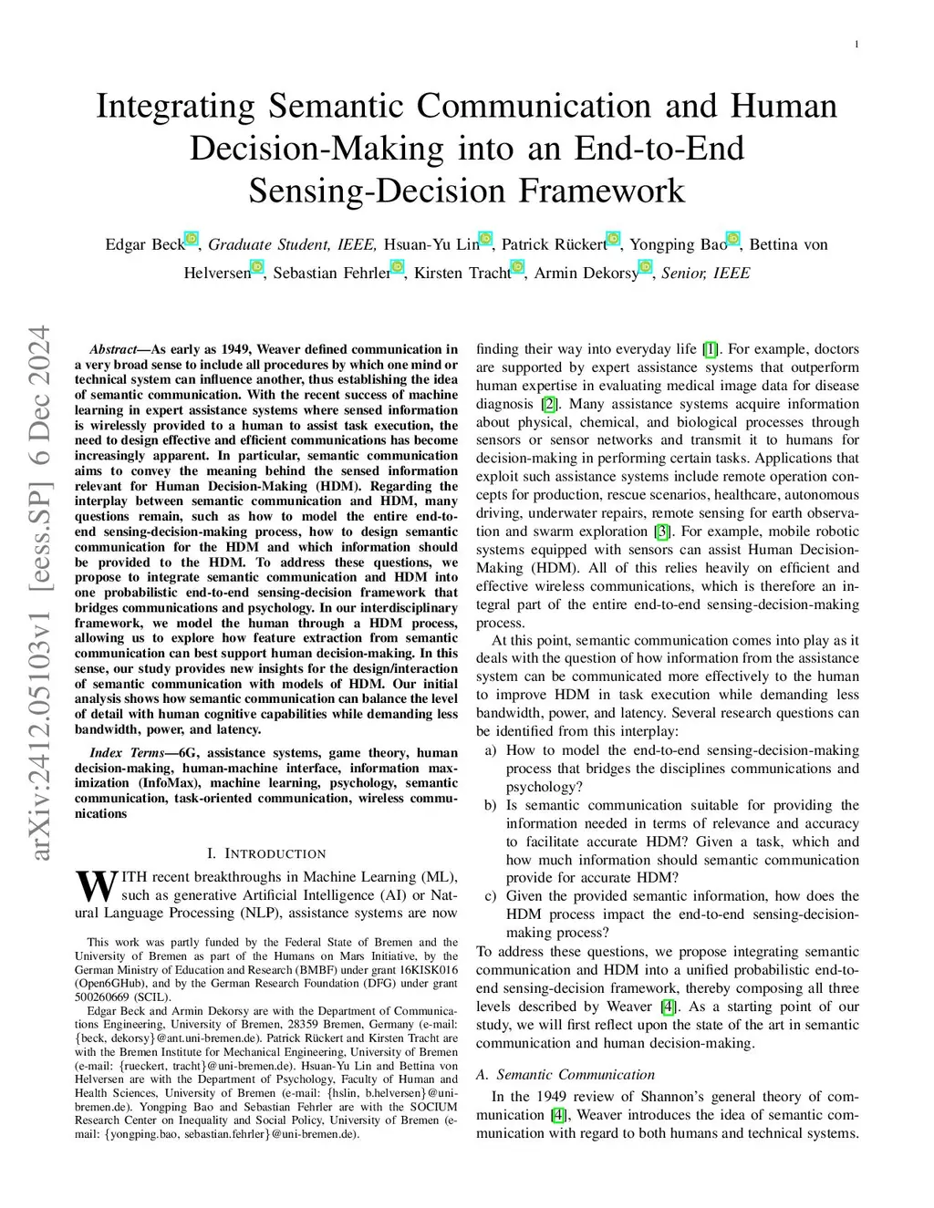 As early as 1949, Weaver defined communication in a very broad sense to include all procedures by which one mind or technical system can influence another, thus establishing the idea of semantic communication. With the recent success of machine learning in expert assistance systems where sensed information is wirelessly provided to a human to assist task execution, the need to design effective and efficient communications has become increasingly apparent. In particular, semantic communication aims to convey the meaning behind the sensed information relevant for Human Decision-Making (HDM). Regarding the interplay between semantic communication and HDM, many questions remain, such as how to model the entire end-to-end sensing-decision-making process, how to design semantic communication for the HDM and which information should be provided for HDM. To address these questions, we propose to integrate semantic communication and HDM into one probabilistic end-to-end sensing-decision framework that bridges communications and psychology. In our interdisciplinary framework, we model the human through a HDM process, allowing us to explore how feature extraction from semantic communication can best support HDM both in theory and in simulations. In this sense, our study reveals the fundamental design trade-off between maximizing the relevant semantic information and matching the cognitive capabilities of the HDM model. Our initial analysis shows how semantic communication can balance the level of detail with human cognitive capabilities while demanding less bandwidth, power, and latency.