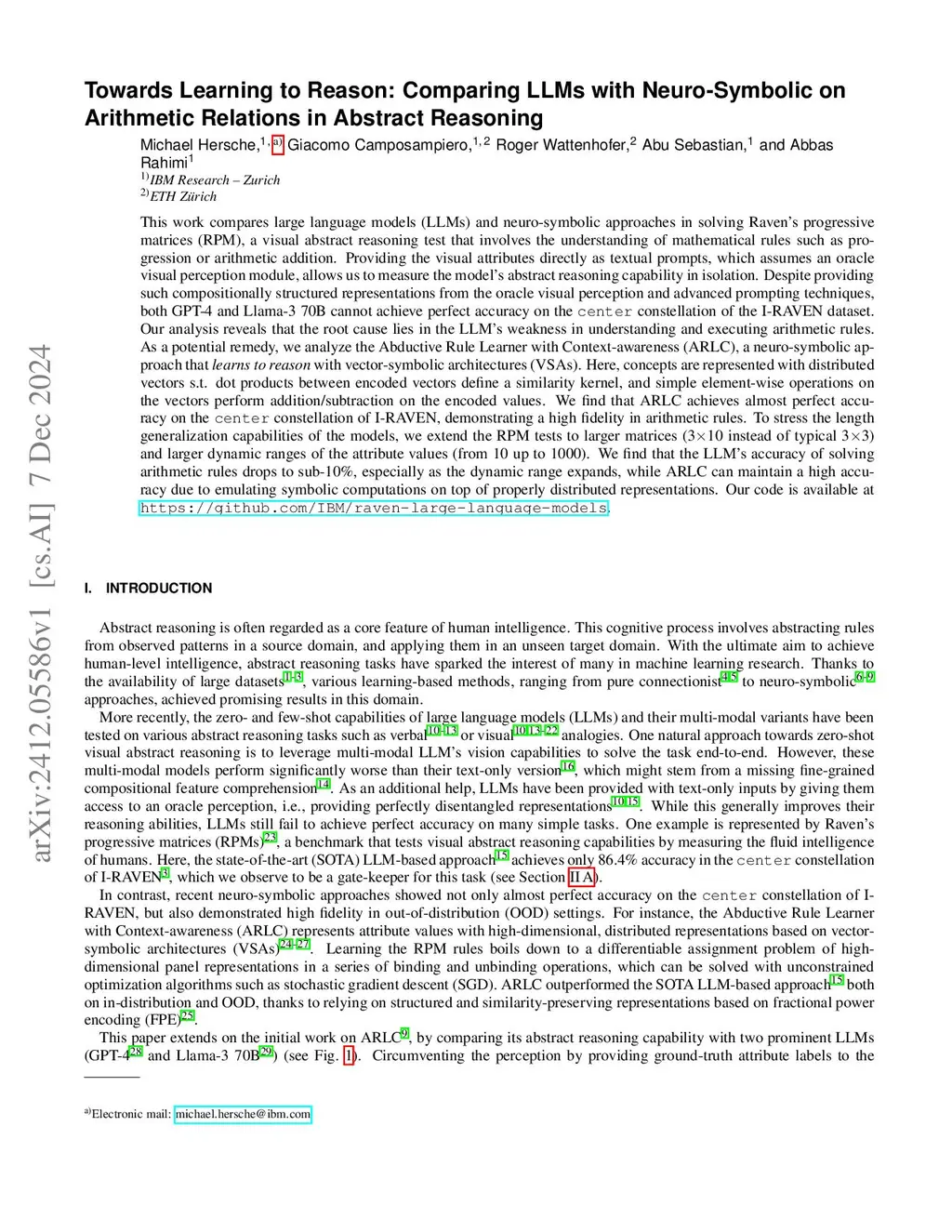 This work compares large language models (LLMs) and neuro-symbolic approaches in solving Raven's progressive matrices (RPM), a visual abstract reasoning test that involves the understanding of mathematical rules such as progression or arithmetic addition. Providing the visual attributes directly as textual prompts, which assumes an oracle visual perception module, allows us to measure the model's abstract reasoning capability in isolation. Despite providing such compositionally structured representations from the oracle visual perception and advanced prompting techniques, both GPT-4 and Llama-3 70B cannot achieve perfect accuracy on the center constellation of the I-RAVEN dataset. Our analysis reveals that the root cause lies in the LLM's weakness in understanding and executing arithmetic rules. As a potential remedy, we analyze the Abductive Rule Learner with Context-awareness (ARLC), a neuro-symbolic approach that learns to reason with vector-symbolic architectures (VSAs). Here, concepts are represented with distributed vectors s.t. dot products between encoded vectors define a similarity kernel, and simple element-wise operations on the vectors perform addition/subtraction on the encoded values. We find that ARLC achieves almost perfect accuracy on the center constellation of I-RAVEN, demonstrating a high fidelity in arithmetic rules. To stress the length generalization capabilities of the models, we extend the RPM tests to larger matrices (3x10 instead of typical 3x3) and larger dynamic ranges of the attribute values (from 10 up to 1000). We find that the LLM's accuracy of solving arithmetic rules drops to sub-10%, especially as the dynamic range expands, while ARLC can maintain a high accuracy due to emulating symbolic computations on top of properly distributed representations. Our code is available at https://github.com/IBM/raven-large-language-models.