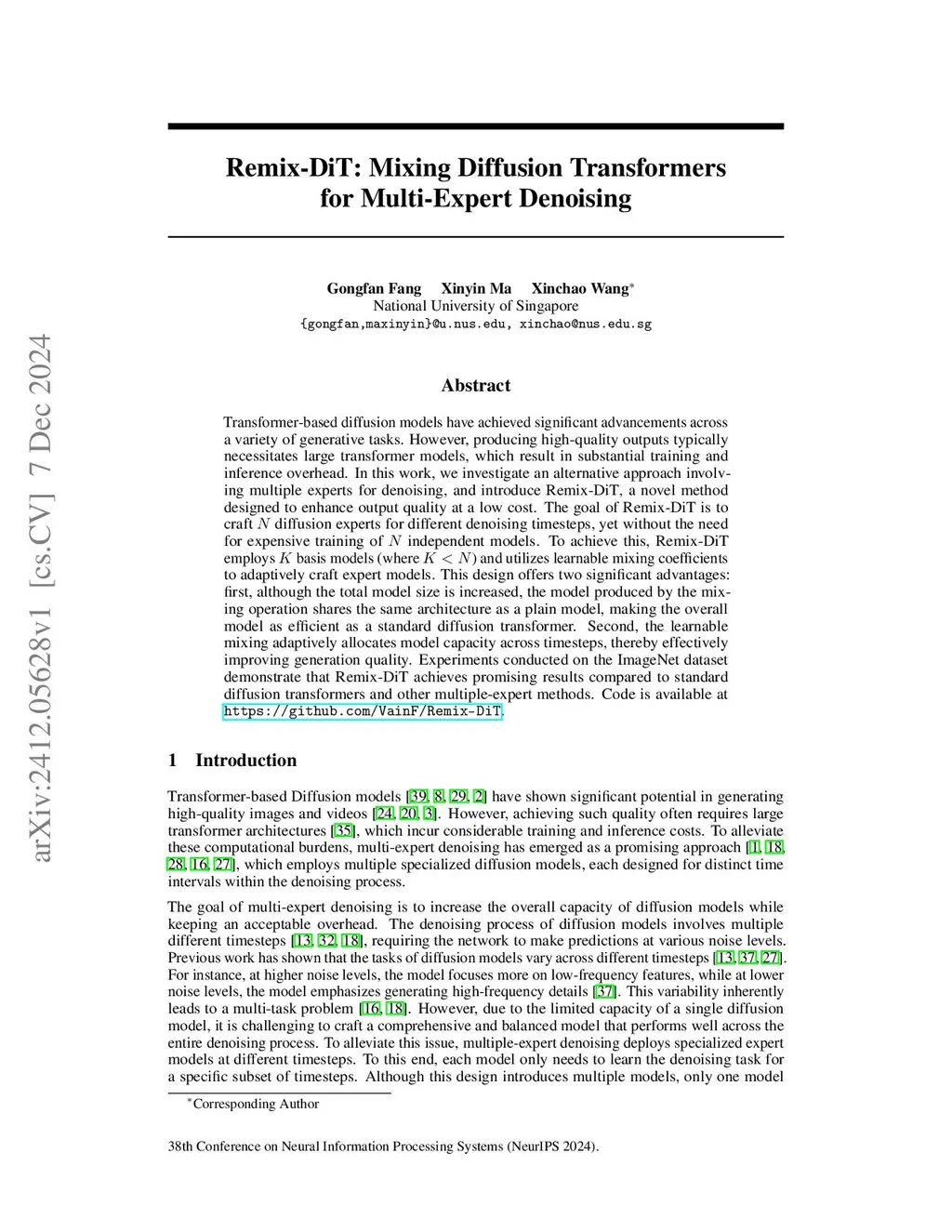 Transformer-based diffusion models have achieved significant advancements across a variety of generative tasks. However, producing high-quality outputs typically necessitates large transformer models, which result in substantial training and inference overhead. In this work, we investigate an alternative approach involving multiple experts for denoising, and introduce Remix-DiT, a novel method designed to enhance output quality at a low cost. The goal of Remix-DiT is to craft N diffusion experts for different denoising timesteps, yet without the need for expensive training of N independent models. To achieve this, Remix-DiT employs K basis models (where K < N) and utilizes learnable mixing coefficients to adaptively craft expert models. This design offers two significant advantages: first, although the total model size is increased, the model produced by the mixing operation shares the same architecture as a plain model, making the overall model as efficient as a standard diffusion transformer. Second, the learnable mixing adaptively allocates model capacity across timesteps, thereby effectively improving generation quality. Experiments conducted on the ImageNet dataset demonstrate that Remix-DiT achieves promising results compared to standard diffusion transformers and other multiple-expert methods. The code is available at https://github.com/VainF/Remix-DiT.