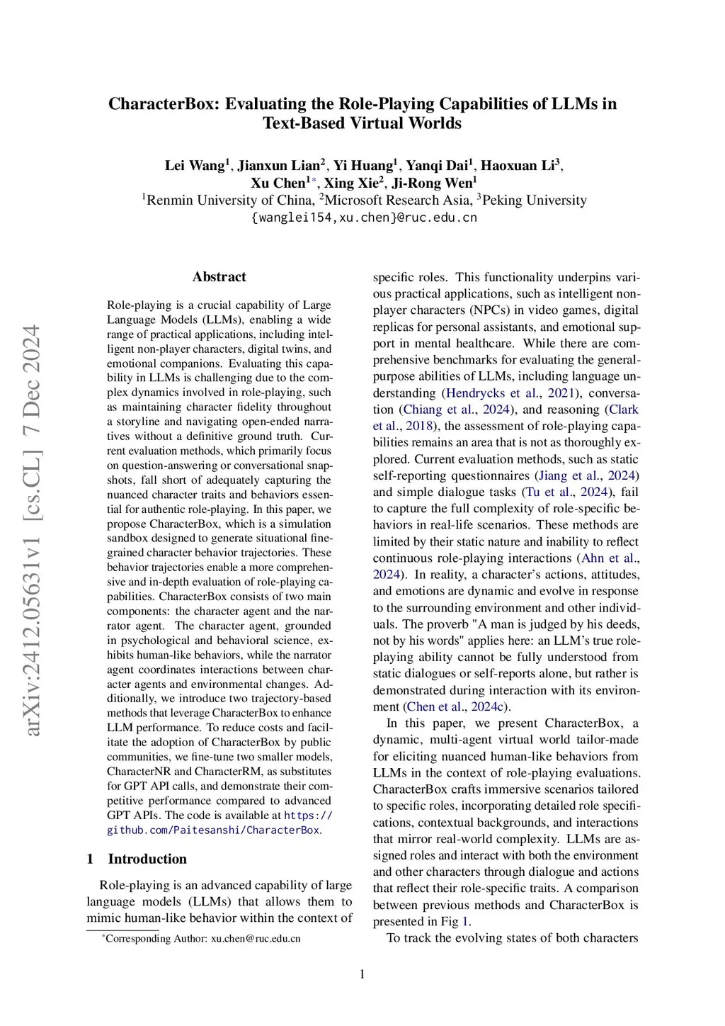 Role-playing is a crucial capability of Large Language Models (LLMs), enabling a wide range of practical applications, including intelligent non-player characters, digital twins, and emotional companions. Evaluating this capability in LLMs is challenging due to the complex dynamics involved in role-playing, such as maintaining character fidelity throughout a storyline and navigating open-ended narratives without a definitive ground truth. Current evaluation methods, which primarily focus on question-answering or conversational snapshots, fall short of adequately capturing the nuanced character traits and behaviors essential for authentic role-playing. In this paper, we propose CharacterBox, which is a simulation sandbox designed to generate situational fine-grained character behavior trajectories. These behavior trajectories enable a more comprehensive and in-depth evaluation of role-playing capabilities. CharacterBox consists of two main components: the character agent and the narrator agent. The character agent, grounded in psychological and behavioral science, exhibits human-like behaviors, while the narrator agent coordinates interactions between character agents and environmental changes. Additionally, we introduce two trajectory-based methods that leverage CharacterBox to enhance LLM performance. To reduce costs and facilitate the adoption of CharacterBox by public communities, we fine-tune two smaller models, CharacterNR and CharacterRM, as substitutes for GPT API calls, and demonstrate their competitive performance compared to advanced GPT APIs.