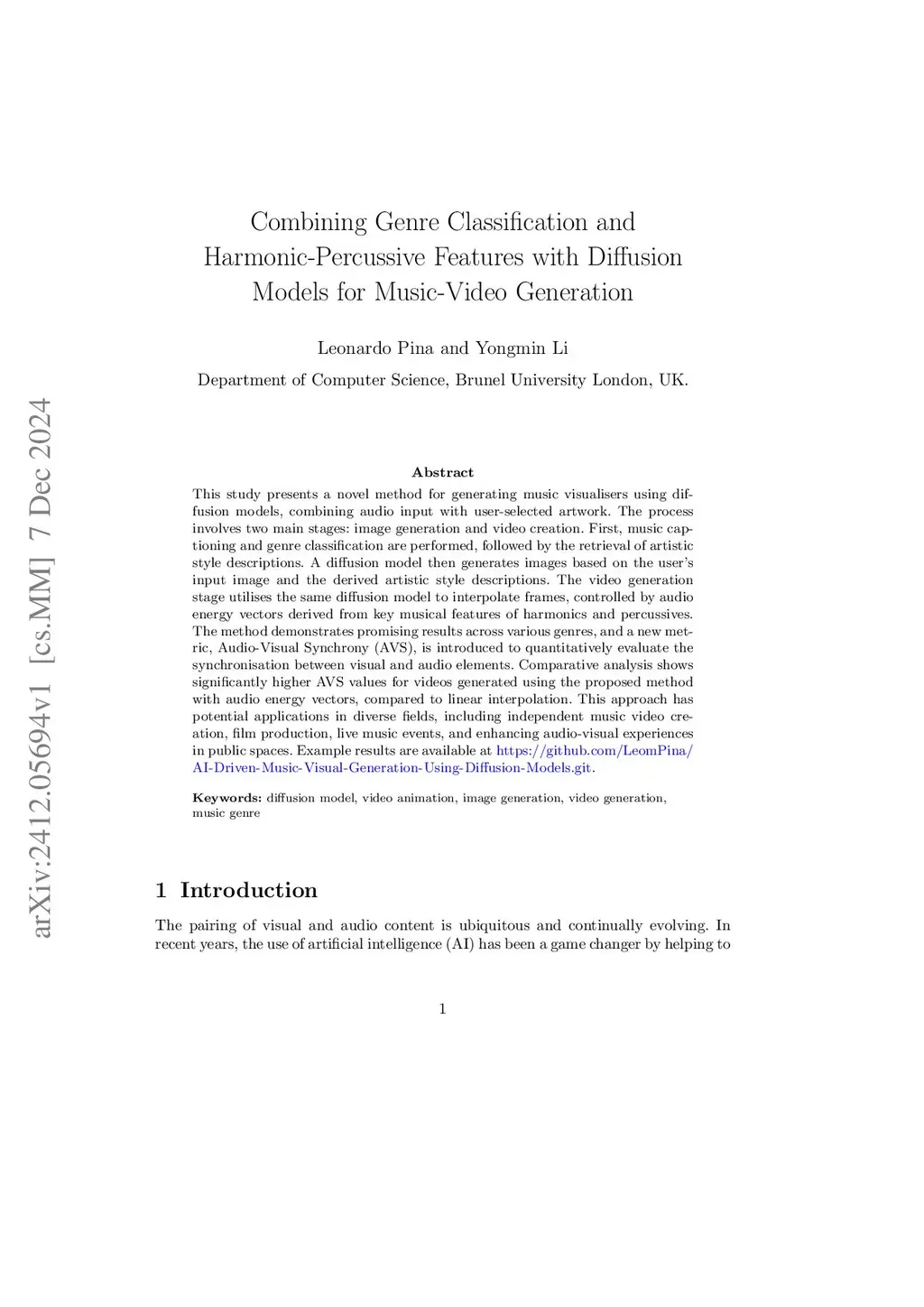 This study presents a novel method for generating music visualisers using diffusion models, combining audio input with user-selected artwork. The process involves two main stages: image generation and video creation. First, music captioning and genre classification are performed, followed by the retrieval of artistic style descriptions. A diffusion model then generates images based on the user's input image and the derived artistic style descriptions. The video generation stage utilises the same diffusion model to interpolate frames, controlled by audio energy vectors derived from key musical features of harmonics and percussives. The method demonstrates promising results across various genres, and a new metric, Audio-Visual Synchrony (AVS), is introduced to quantitatively evaluate the synchronisation between visual and audio elements. Comparative analysis shows significantly higher AVS values for videos generated using the proposed method with audio energy vectors, compared to linear interpolation. This approach has potential applications in diverse fields, including independent music video creation, film production, live music events, and enhancing audio-visual experiences in public spaces.