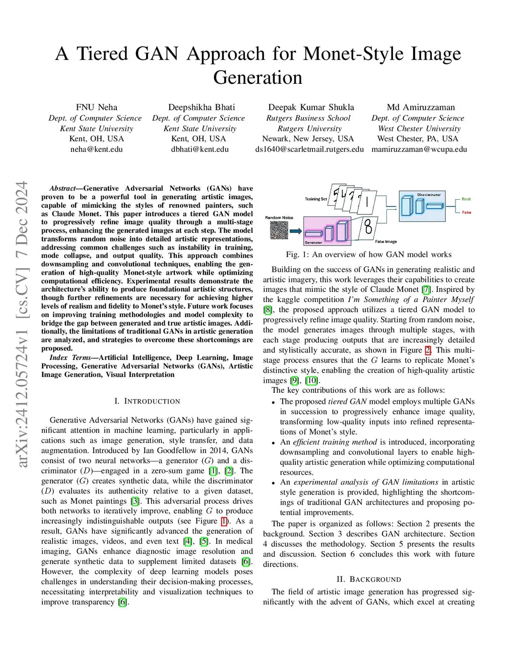 Generative Adversarial Networks (GANs) have proven to be a powerful tool in generating artistic images, capable of mimicking the styles of renowned painters, such as Claude Monet. This paper introduces a tiered GAN model to progressively refine image quality through a multi-stage process, enhancing the generated images at each step. The model transforms random noise into detailed artistic representations, addressing common challenges such as instability in training, mode collapse, and output quality. This approach combines downsampling and convolutional techniques, enabling the generation of high-quality Monet-style artwork while optimizing computational efficiency. Experimental results demonstrate the architecture's ability to produce foundational artistic structures, though further refinements are necessary for achieving higher levels of realism and fidelity to Monet's style. Future work focuses on improving training methodologies and model complexity to bridge the gap between generated and true artistic images. Additionally, the limitations of traditional GANs in artistic generation are analyzed, and strategies to overcome these shortcomings are proposed.