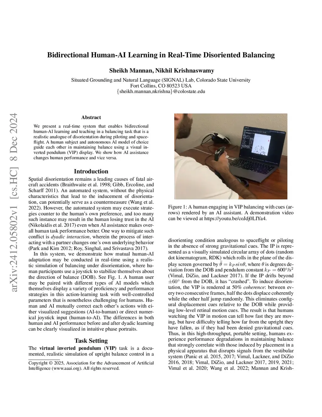 We present a real-time system that enables bidirectional human-AI learning and teaching in a balancing task that is a realistic analogue of disorientation during piloting and spaceflight. A human subject and autonomous AI model of choice guide each other in maintaining balance using a visual inverted pendulum (VIP) display. We show how AI assistance changes human performance and vice versa.