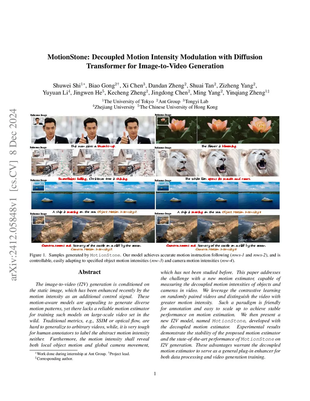 The image-to-video (I2V) generation is conditioned on the static image, which has been enhanced recently by the motion intensity as an additional control signal. These motion-aware models are appealing to generate diverse motion patterns, yet there lacks a reliable motion estimator for training such models on large-scale video set in the wild. Traditional metrics, e.g., SSIM or optical flow, are hard to generalize to arbitrary videos, while, it is very tough for human annotators to label the abstract motion intensity neither. Furthermore, the motion intensity shall reveal both local object motion and global camera movement, which has not been studied before. This paper addresses the challenge with a new motion estimator, capable of measuring the decoupled motion intensities of objects and cameras in video. We leverage the contrastive learning on randomly paired videos and distinguish the video with greater motion intensity. Such a paradigm is friendly for annotation and easy to scale up to achieve stable performance on motion estimation. We then present a new I2V model, named MotionStone, developed with the decoupled motion estimator. Experimental results demonstrate the stability of the proposed motion estimator and the state-of-the-art performance of MotionStone on I2V generation. These advantages warrant the decoupled motion estimator to serve as a general plug-in enhancer for both data processing and video generation training.