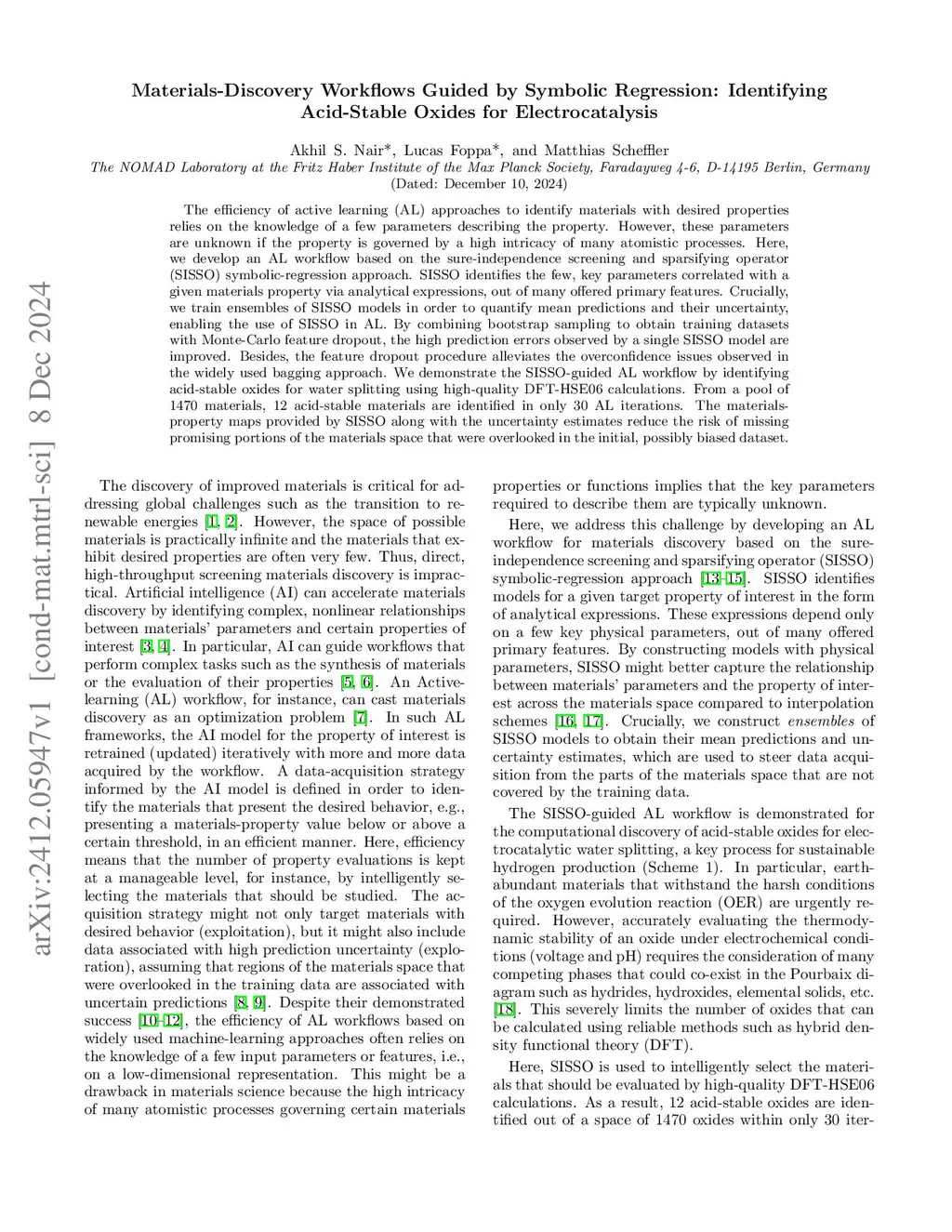 The efficiency of active learning (AL) approaches to identify materials with desired properties relies on the knowledge of a few parameters describing the property. However, these parameters are unknown if the property is governed by a high intricacy of many atomistic processes. Here, we develop an AL workflow based on the sure-independence screening and sparsifying operator (SISSO) symbolic-regression approach. SISSO identifies the few, key parameters correlated with a given materials property via analytical expressions, out of many offered primary features. Crucially, we train ensembles of SISSO models in order to quantify mean predictions and their uncertainty, enabling the use of SISSO in AL. By combining bootstrap sampling to obtain training datasets with Monte-Carlo feature dropout, the high prediction errors observed by a single SISSO model are improved. Besides, the feature dropout procedure alleviates the overconfidence issues observed in the widely used bagging approach. We demonstrate the SISSO-guided AL workflow by identifying acid-stable oxides for water splitting using high-quality DFT-HSE06 calculations. From a pool of 1470 materials, 12 acid-stable materials are identified in only 30 AL iterations. The materials property maps provided by SISSO along with the uncertainty estimates reduce the risk of missing promising portions of the materials space that were overlooked in the initial, possibly biased dataset.