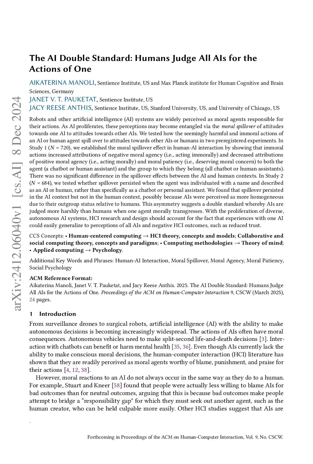 Robots and other artificial intelligence (AI) systems are widely perceived as moral agents responsible for their actions. As AI proliferates, these perceptions may become entangled via the moral spillover of attitudes towards one AI to attitudes towards other AIs. We tested how the seemingly harmful and immoral actions of an AI or human agent spill over to attitudes towards other AIs or humans in two preregistered experiments. In Study 1 (N = 720), we established the moral spillover effect in human-AI interaction by showing that immoral actions increased attributions of negative moral agency (i.e., acting immorally) and decreased attributions of positive moral agency (i.e., acting morally) and moral patiency (i.e., deserving moral concern) to both the agent (a chatbot or human assistant) and the group to which they belong (all chatbot or human assistants). There was no significant difference in the spillover effects between the AI and human contexts. In Study 2 (N = 684), we tested whether spillover persisted when the agent was individuated with a name and described as an AI or human, rather than specifically as a chatbot or personal assistant. We found that spillover persisted in the AI context but not in the human context, possibly because AIs were perceived as more homogeneous due to their outgroup status relative to humans. This asymmetry suggests a double standard whereby AIs are judged more harshly than humans when one agent morally transgresses. With the proliferation of diverse, autonomous AI systems, HCI research and design should account for the fact that experiences with one AI could easily generalize to perceptions of all AIs and negative HCI outcomes, such as reduced trust.