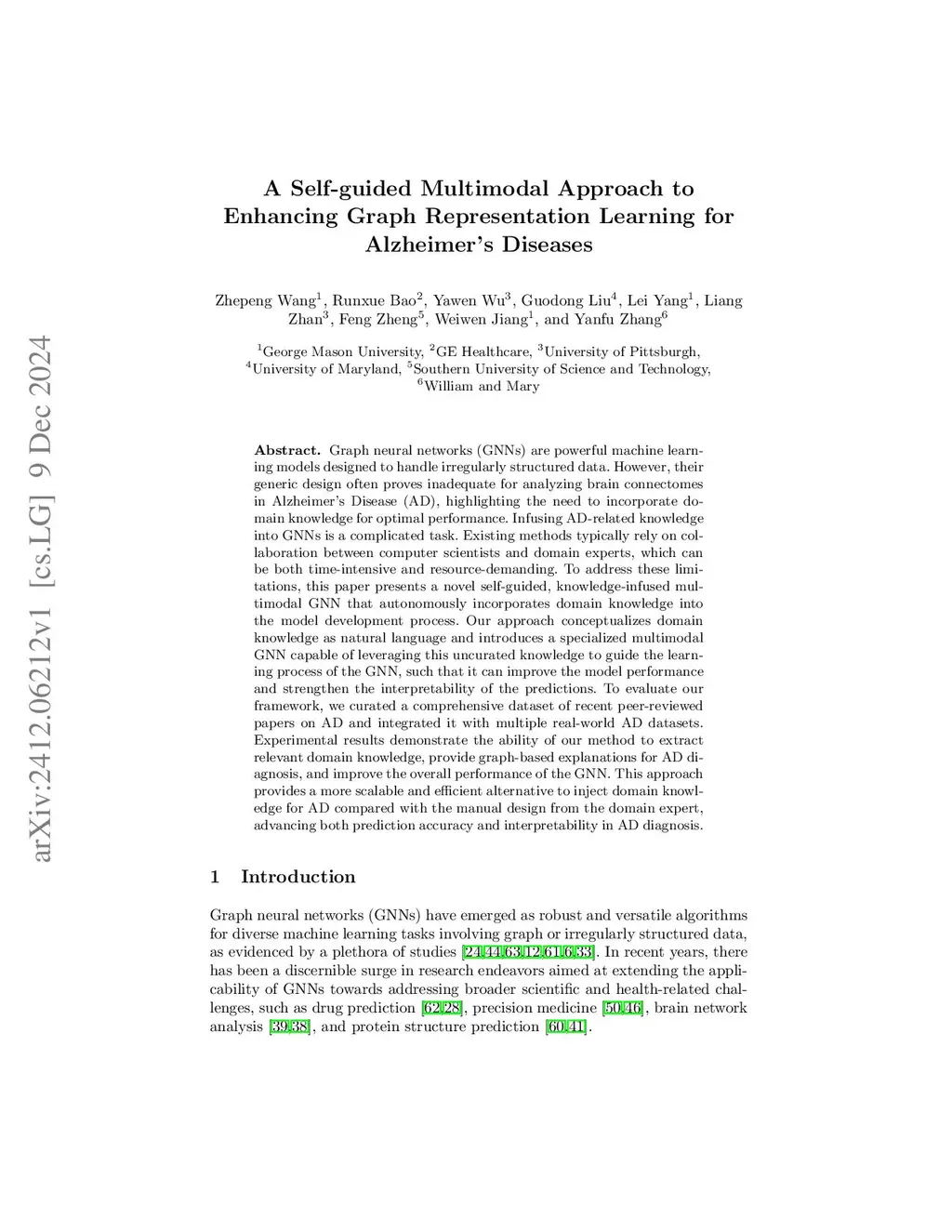 Graph neural networks (GNNs) are powerful machine learning models designed to handle irregularly structured data. However, their generic design often proves inadequate for analyzing brain connectomes in Alzheimer's Disease (AD), highlighting the need to incorporate domain knowledge for optimal performance. Infusing AD-related knowledge into GNNs is a complicated task. Existing methods typically rely on collaboration between computer scientists and domain experts, which can be both time-intensive and resource-demanding. To address these limitations, this paper presents a novel self-guided, knowledge-infused multimodal GNN that autonomously incorporates domain knowledge into the model development process. Our approach conceptualizes domain knowledge as natural language and introduces a specialized multimodal GNN capable of leveraging this uncurated knowledge to guide the learning process of the GNN, such that it can improve the model performance and strengthen the interpretability of the predictions. To evaluate our framework, we curated a comprehensive dataset of recent peer-reviewed papers on AD and integrated it with multiple real-world AD datasets. Experimental results demonstrate the ability of our method to extract relevant domain knowledge, provide graph-based explanations for AD diagnosis, and improve the overall performance of the GNN. This approach provides a more scalable and efficient alternative to inject domain knowledge for AD compared with the manual design from the domain expert, advancing both prediction accuracy and interpretability in AD diagnosis.
