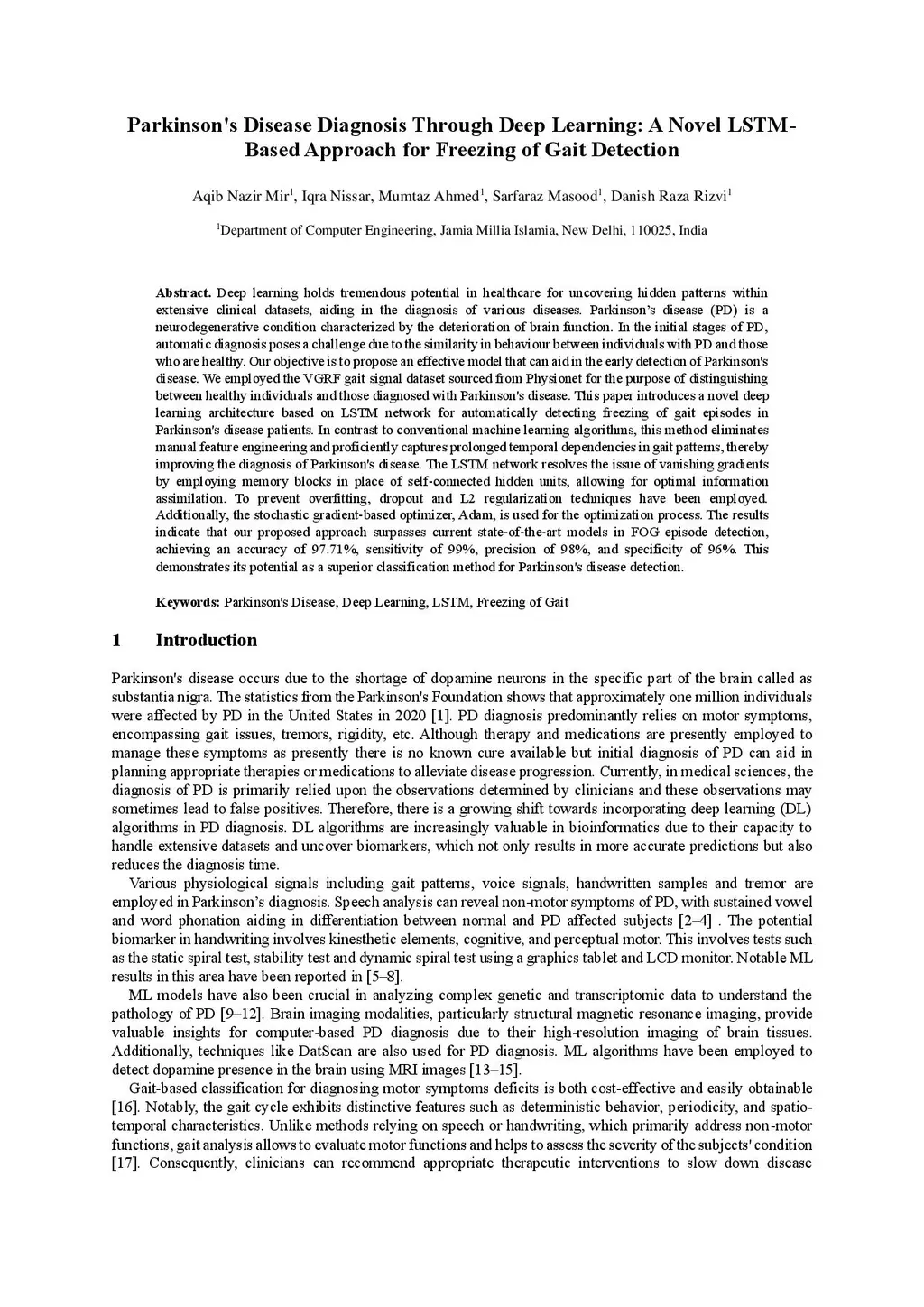 Deep learning holds tremendous potential in healthcare for uncovering hidden patterns within extensive clinical datasets, aiding in the diagnosis of various diseases. Parkinson's disease (PD) is a neurodegenerative condition characterized by the deterioration of brain function. In the initial stages of PD, automatic diagnosis poses a challenge due to the similarity in behavior between individuals with PD and those who are healthy. Our objective is to propose an effective model that can aid in the early detection of Parkinson's disease. We employed the VGRF gait signal dataset sourced from Physionet for distinguishing between healthy individuals and those diagnosed with Parkinson's disease. This paper introduces a novel deep learning architecture based on the LSTM network for automatically detecting freezing of gait episodes in Parkinson's disease patients. In contrast to conventional machine learning algorithms, this method eliminates manual feature engineering and proficiently captures prolonged temporal dependencies in gait patterns, thereby improving the diagnosis of Parkinson's disease. The LSTM network resolves the issue of vanishing gradients by employing memory blocks in place of self-connected hidden units, allowing for optimal information assimilation. To prevent overfitting, dropout and L2 regularization techniques have been employed. Additionally, the stochastic gradient-based optimizer Adam is used for the optimization process. The results indicate that our proposed approach surpasses current state-of-the-art models in FOG episode detection, achieving an accuracy of 97.71%, sensitivity of 99%, precision of 98%, and specificity of 96%. This demonstrates its potential as a superior classification method for Parkinson's disease detection.