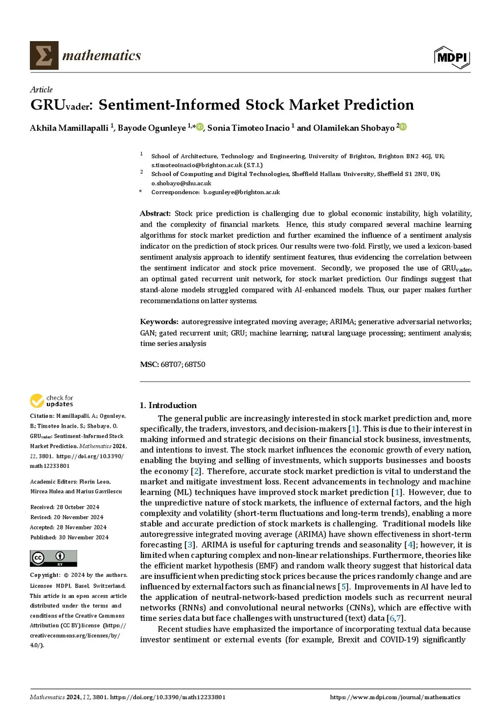 Stock price prediction is challenging due to global economic instability, high volatility, and the complexity of financial markets. Hence, this study compared several machine learning algorithms for stock market prediction and further examined the influence of a sentiment analysis indicator on the prediction of stock prices. Our results were two-fold. Firstly, we used a lexicon-based sentiment analysis approach to identify sentiment features, thus evidencing the correlation between the sentiment indicator and stock price movement. Secondly, we proposed the use of GRUvader, an optimal gated recurrent unit network, for stock market prediction. Our findings suggest that stand-alone models struggled compared with AI-enhanced models. Thus, our paper makes further recommendations on latter systems.