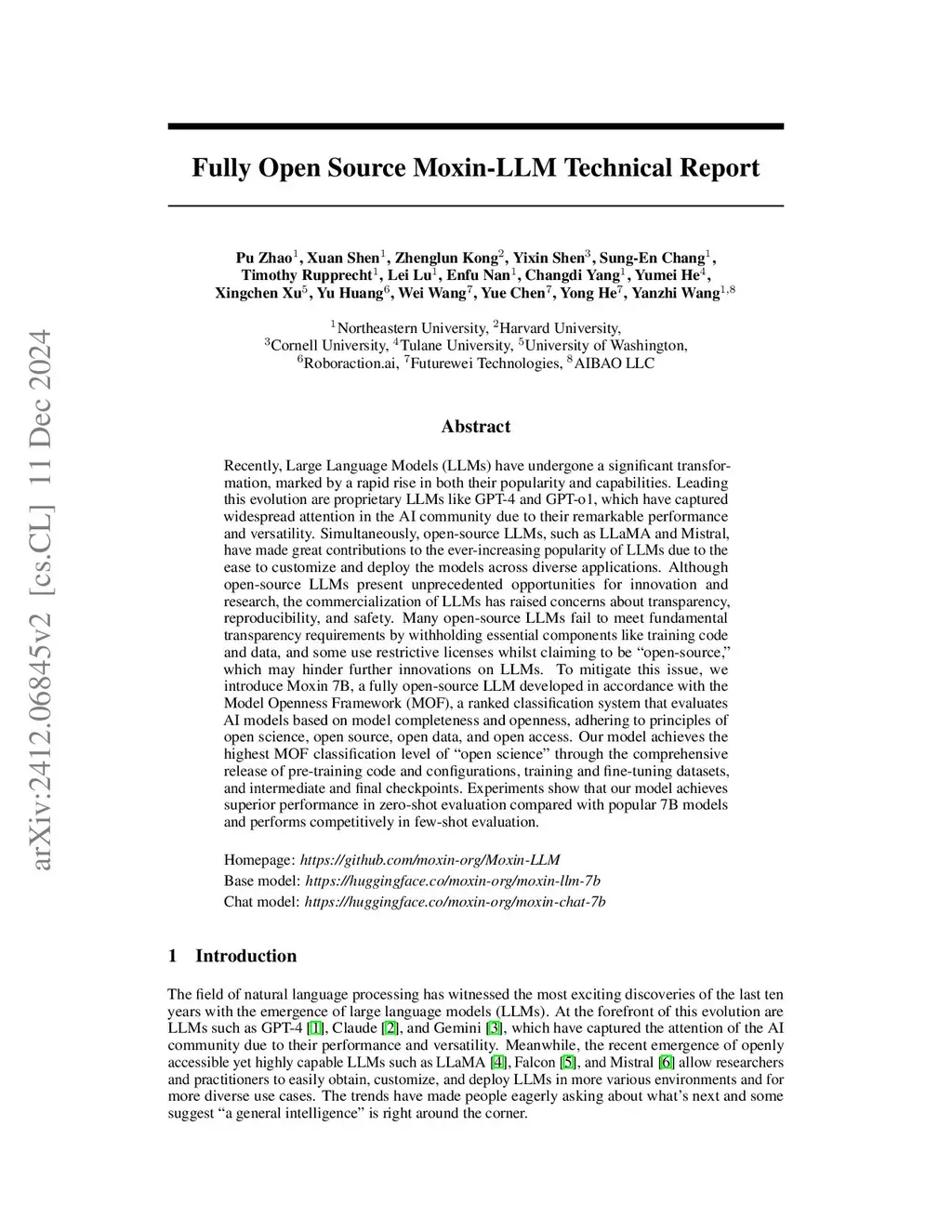 Recently, Large Language Models (LLMs) have undergone a significant transformation, marked by a rapid rise in both their popularity and capabilities. Leading this evolution are proprietary LLMs like GPT-4 and GPT-o1, which have captured widespread attention in the AI community due to their remarkable performance and versatility. Simultaneously, open-source LLMs, such as LLaMA, have made great contributions to the ever-increasing popularity of LLMs due to the ease to customize and deploy the models across diverse applications. Although open-source LLMs present unprecedented opportunities for innovation and research, the commercialization of LLMs has raised concerns about transparency, reproducibility, and safety. Many open-source LLMs fail to meet fundamental transparency requirements by withholding essential components like training code and data, which may hinder further innovations on LLMs. To mitigate this issue, we introduce Moxin 7B, a fully open-source LLM developed, adhering to principles of open science, open source, open data, and open access. We release the pre-training code and configurations, training and fine-tuning datasets, and intermediate and final checkpoints, aiming to make continuous commitments to fully open-source LLMs. After pre-training the base model, we finetune the Moxin Base model with SOTA post-training framework and instruction data to obtain Moxin Instruct model. To improve the reasoning capability, we further finetune our Instruct model with chain-of-thought data distilled from DeepSeek R1, and then use Group Relative Policy Optimization (GRPO) following DeepSeek R1 to finetune our model, leading to the Moxin Reasoning model. Moreover, we develop our vision language model based on our Moxin model. Experiments show that our models achieve superior performance in various evaluations such as zero-shot evaluation, few-shot evaluation, and CoT evaluation.