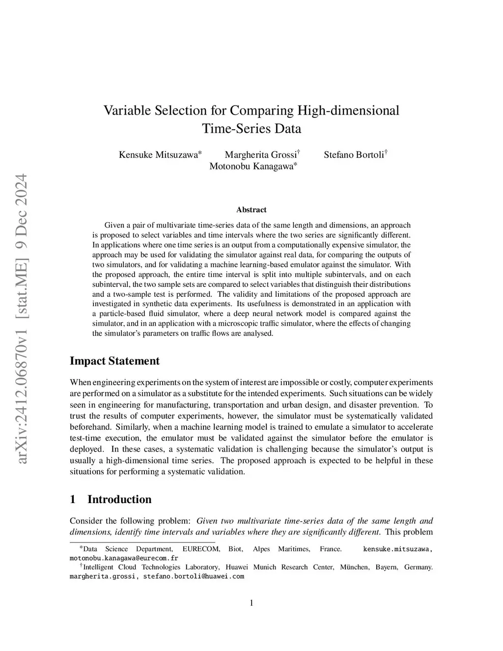 Given a pair of multivariate time-series data of the same length and dimensions, an approach is proposed to select variables and time intervals where the two series are significantly different. In applications where one time series is an output from a computationally expensive simulator, the approach may be used for validating the simulator against real data, for comparing the outputs of two simulators, and for validating a machine learning-based emulator against the simulator. With the proposed approach, the entire time interval is split into multiple subintervals, and on each subinterval, the two sample sets are compared to select variables that distinguish their distributions and a two-sample test is performed. The validity and limitations of the proposed approach are investigated in synthetic data experiments. Its usefulness is demonstrated in an application with a particle-based fluid simulator, where a deep neural network model is compared against the simulator, and in an application with a microscopic traffic simulator, where the effects of changing the simulator's parameters on traffic flows are analysed.