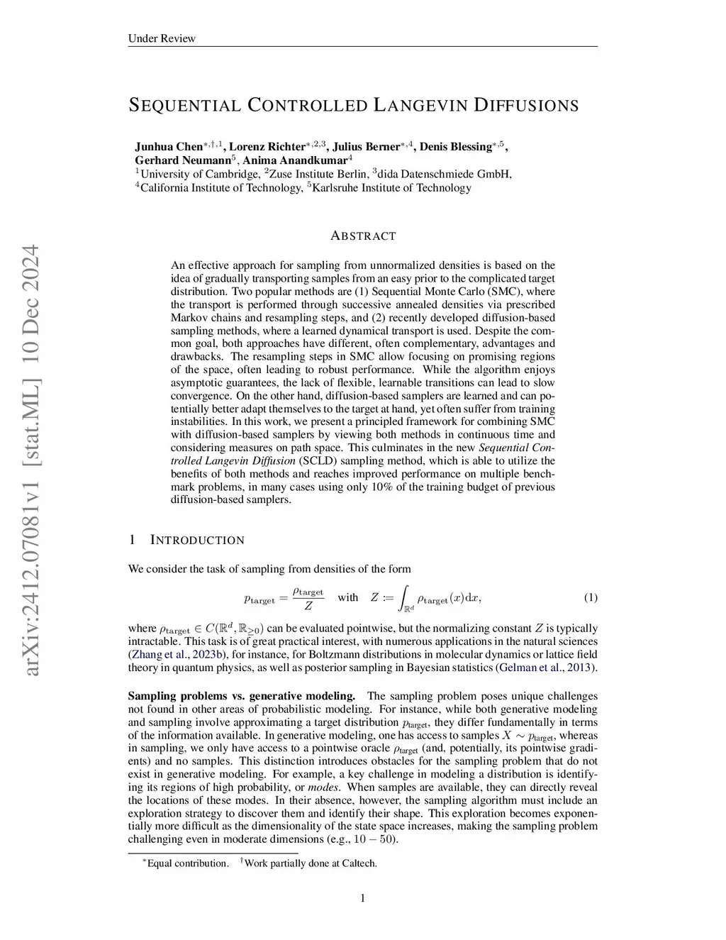 An effective approach for sampling from unnormalized densities is based on the idea of gradually transporting samples from an easy prior to the complicated target distribution. Two popular methods are (1) Sequential Monte Carlo (SMC), where the transport is performed through successive annealed densities via prescribed Markov chains and resampling steps, and (2) recently developed diffusion-based sampling methods, where a learned dynamical transport is used. Despite the common goal, both approaches have different, often complementary, advantages and drawbacks. The resampling steps in SMC allow focusing on promising regions of the space, often leading to robust performance. While the algorithm enjoys asymptotic guarantees, the lack of flexible, learnable transitions can lead to slow convergence. On the other hand, diffusion-based samplers are learned and can potentially better adapt themselves to the target at hand, yet often suffer from training instabilities. In this work, we present a principled framework for combining SMC with diffusion-based samplers by viewing both methods in continuous time and considering measures on path space. This culminates in the new Sequential Controlled Langevin Diffusion (SCLD) sampling method, which is able to utilize the benefits of both methods and reaches improved performance on multiple benchmark problems, in many cases using only 10% of the training budget of previous diffusion-based samplers.