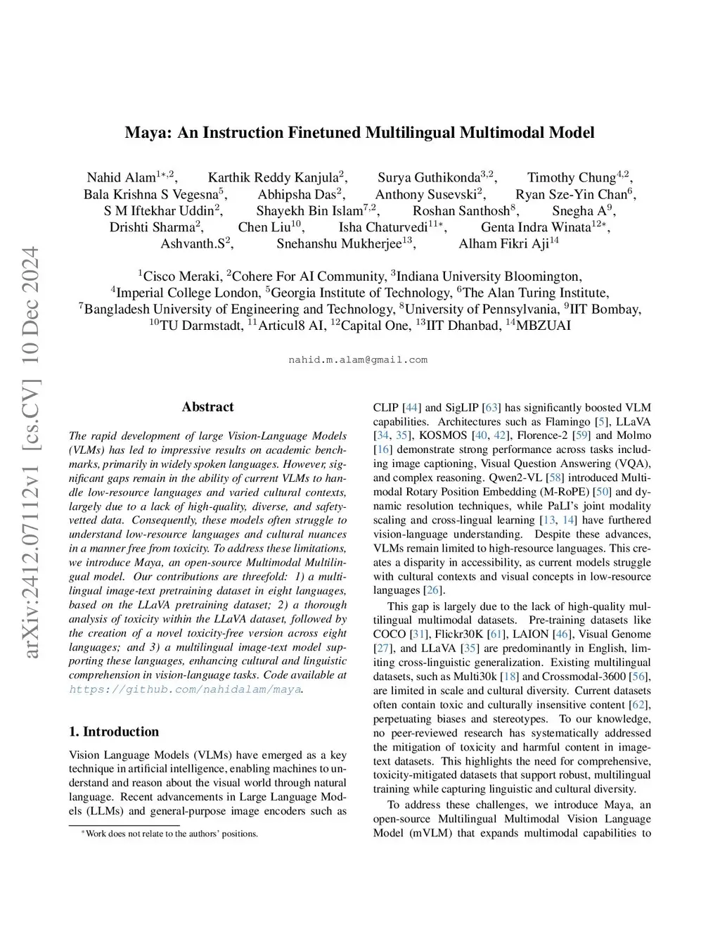 The rapid development of large Vision-Language Models (VLMs) has led to impressive results on academic benchmarks, primarily in widely spoken languages. However, significant gaps remain in the ability of current VLMs to handle low-resource languages and varied cultural contexts, largely due to a lack of high-quality, diverse, and safety-vetted data. Consequently, these models often struggle to understand low-resource languages and cultural nuances in a manner free from toxicity. To address these limitations, we introduce Maya, an open-source Multimodal Multilingual model. Our contributions are threefold: 1) a multilingual image-text pretraining dataset in eight languages, based on the LLaVA pretraining dataset; 2) a thorough analysis of toxicity within the LLaVA dataset, followed by the creation of a novel toxicity-free version across eight languages; and 3) a multilingual image-text model supporting these languages, enhancing cultural and linguistic comprehension in vision-language tasks. Code available at https://github.com/nahidalam/maya.