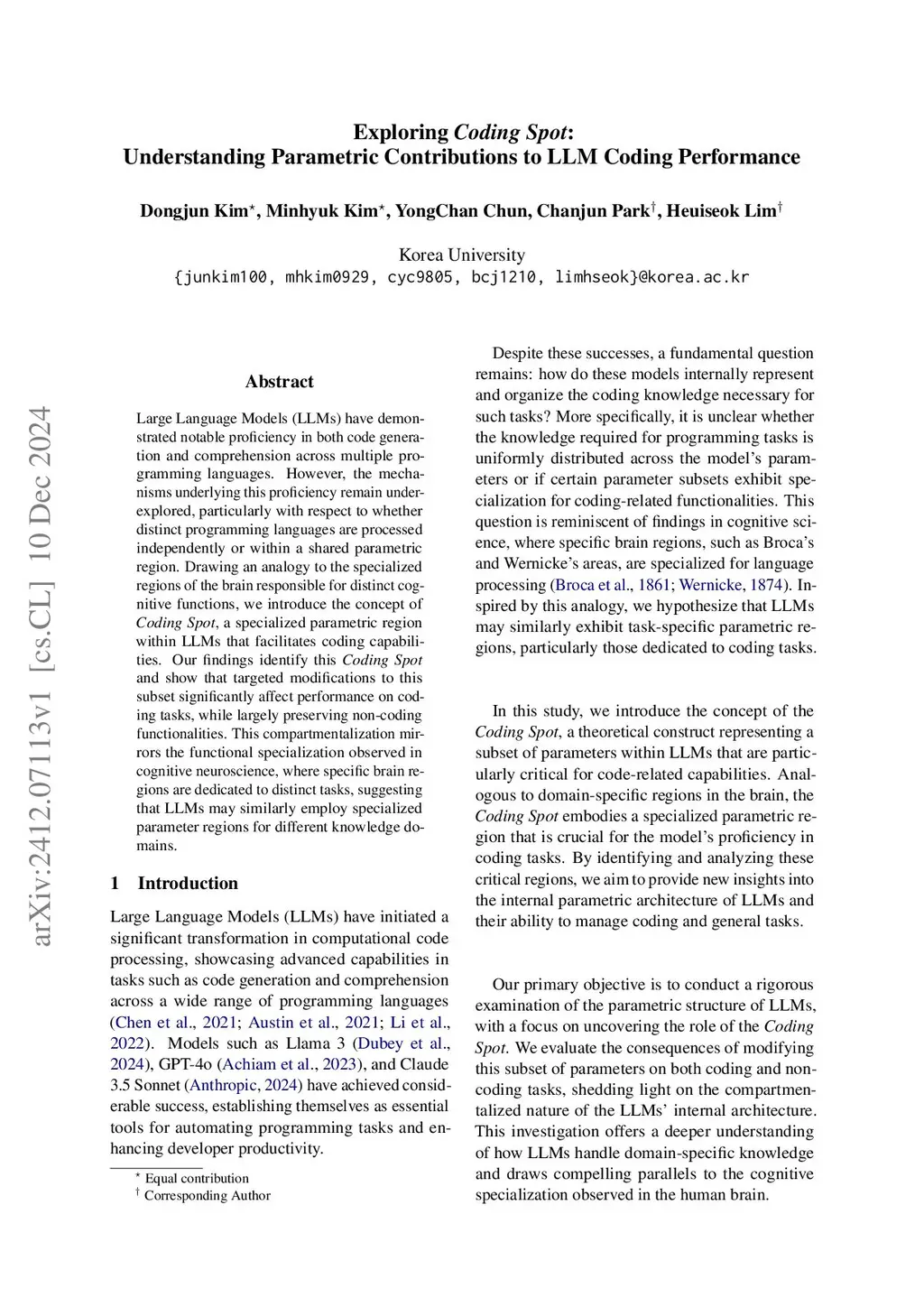 Large Language Models (LLMs) have demonstrated notable proficiency in both code generation and comprehension across multiple programming languages. However, the mechanisms underlying this proficiency remain underexplored, particularly with respect to whether distinct programming languages are processed independently or within a shared parametric region. Drawing an analogy to the specialized regions of the brain responsible for distinct cognitive functions, we introduce the concept of Coding Spot, a specialized parametric region within LLMs that facilitates coding capabilities. Our findings identify this Coding Spot and show that targeted modifications to this subset significantly affect performance on coding tasks, while largely preserving non-coding functionalities. This compartmentalization mirrors the functional specialization observed in cognitive neuroscience, where specific brain regions are dedicated to distinct tasks, suggesting that LLMs may similarly employ specialized parameter regions for different knowledge domains.