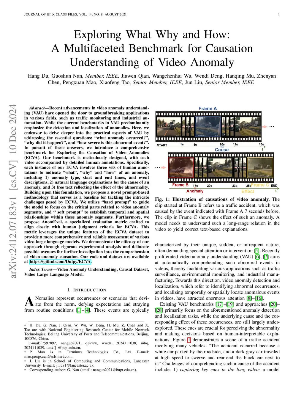 Recent advancements in video anomaly understanding (VAU) have opened the door to groundbreaking applications in various fields, such as traffic monitoring and industrial automation. While the current benchmarks in VAU predominantly emphasize the detection and localization of anomalies. Here, we endeavor to delve deeper into the practical aspects of VAU by addressing the essential questions: "what anomaly occurred?", "why did it happen?", and "how severe is this abnormal event?". In pursuit of these answers, we introduce a comprehensive benchmark for Exploring the Causation of Video Anomalies (ECVA). Our benchmark is meticulously designed, with each video accompanied by detailed human annotations. Specifically, each instance of our ECVA involves three sets of human annotations to indicate "what", "why" and "how" of an anomaly, including 1) anomaly type, start and end times, and event descriptions, 2) natural language explanations for the cause of an anomaly, and 3) free text reflecting the effect of the abnormality. Building upon this foundation, we propose a novel prompt-based methodology that serves as a baseline for tackling the intricate challenges posed by ECVA. We utilize "hard prompt" to guide the model to focus on the critical parts related to video anomaly segments, and "soft prompt" to establish temporal and spatial relationships within these anomaly segments. Furthermore, we propose AnomEval, a specialized evaluation metric crafted to align closely with human judgment criteria for ECVA. This metric leverages the unique features of the ECVA dataset to provide a more comprehensive and reliable assessment of various video large language models. We demonstrate the efficacy of our approach through rigorous experimental analysis and delineate possible avenues for further investigation into the comprehension of video anomaly causation.