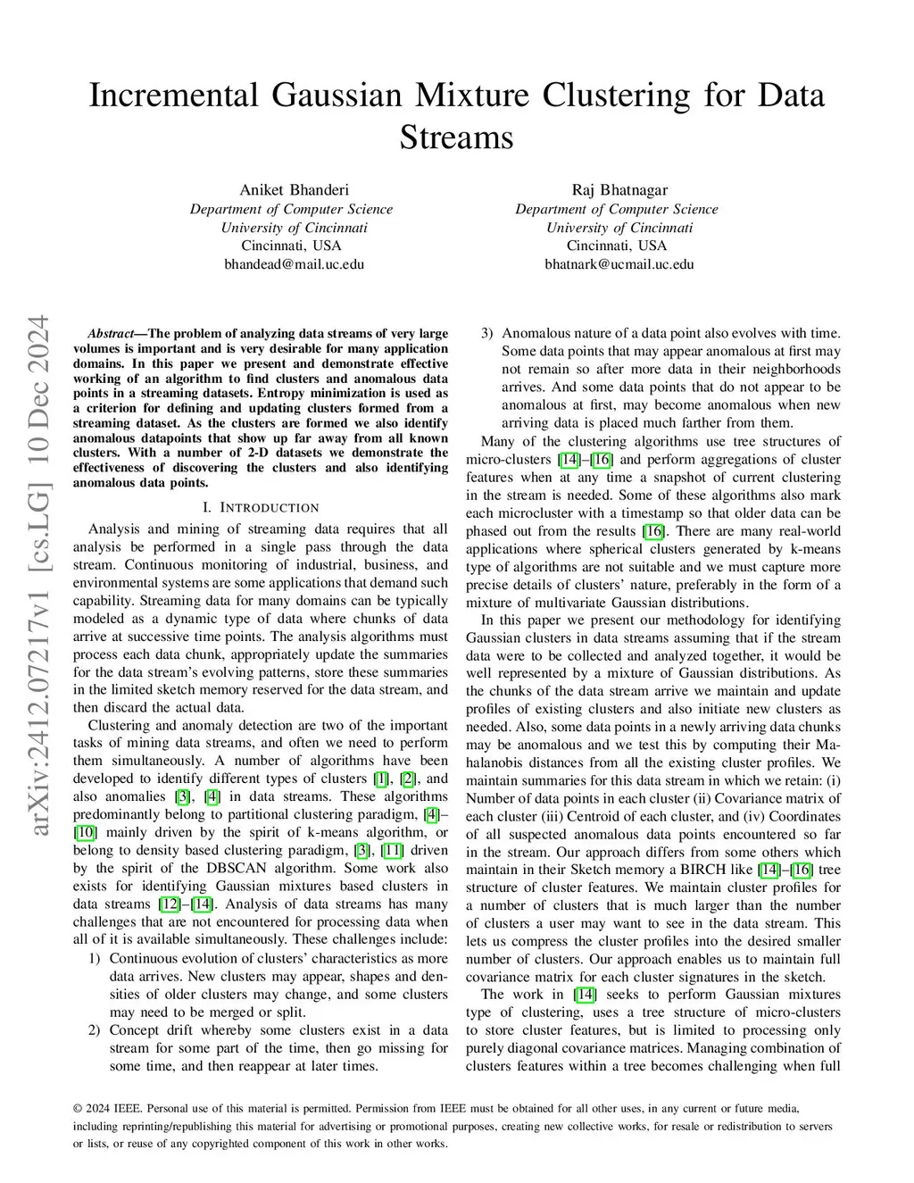 The problem of analyzing data streams of very large volumes is important and is very desirable for many application domains. In this paper we present and demonstrate effective working of an algorithm to find clusters and anomalous data points in a streaming datasets. Entropy minimization is used as a criterion for defining and updating clusters formed from a streaming dataset. As the clusters are formed we also identify anomalous datapoints that show up far away from all known clusters. With a number of 2-D datasets we demonstrate the effectiveness of discovering the clusters and also identifying anomalous data points.