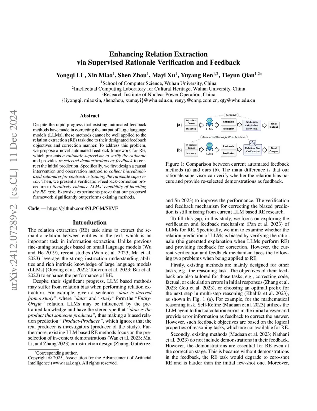 Despite the rapid progress that existing automated feedback methods have made in correcting the output of large language models (LLMs), these methods cannot be well applied to the relation extraction (RE) task due to their designated feedback objectives and correction manner. To address this problem, we propose a novel automated feedback framework for RE, which presents a rationale supervisor to verify the rationale and provides re-selected demonstrations as feedback to correct the initial prediction. Specifically, we first design a causal intervention and observation method to collect biased/unbiased rationales for contrastive training the rationale supervisor. Then, we present a verification-feedback-correction procedure to iteratively enhance LLMs' capability of handling the RE task. Extensive experiments prove that our proposed framework significantly outperforms existing methods.