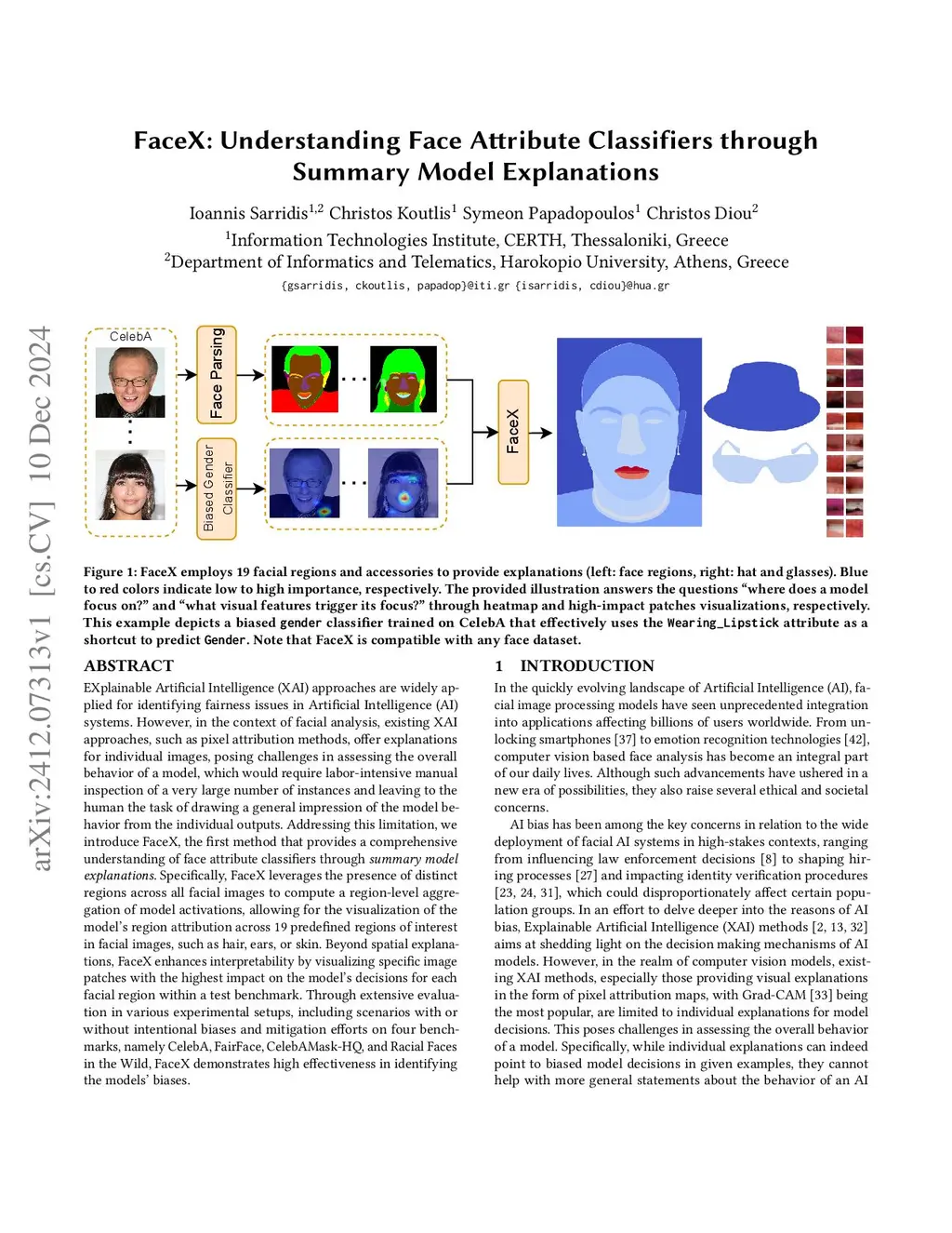 EXplainable Artificial Intelligence (XAI) approaches are widely applied for identifying fairness issues in Artificial Intelligence (AI) systems. However, in the context of facial analysis, existing XAI approaches, such as pixel attribution methods, offer explanations for individual images, posing challenges in assessing the overall behavior of a model, which would require labor-intensive manual inspection of a very large number of instances and leaving to the human the task of drawing a general impression of the model behavior from the individual outputs. Addressing this limitation, we introduce FaceX, the first method that provides a comprehensive understanding of face attribute classifiers through summary model explanations. Specifically, FaceX leverages the presence of distinct regions across all facial images to compute a region-level aggregation of model activations, allowing for the visualization of the model's region attribution across 19 predefined regions of interest in facial images, such as hair, ears, or skin. Beyond spatial explanations, FaceX enhances interpretability by visualizing specific image patches with the highest impact on the model's decisions for each facial region within a test benchmark. Through extensive evaluation in various experimental setups, including scenarios with or without intentional biases and mitigation efforts on four benchmarks, namely CelebA, FairFace, CelebAMask-HQ, and Racial Faces in the Wild, FaceX demonstrates high effectiveness in identifying the models' biases.