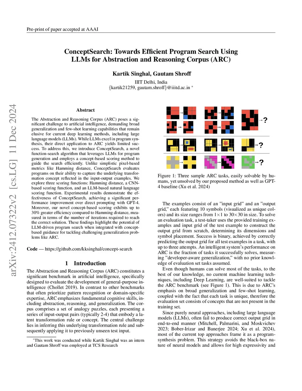 The Abstraction and Reasoning Corpus (ARC) poses a significant challenge to artificial intelligence, demanding broad generalization and few-shot learning capabilities that remain elusive for current deep learning methods, including large language models (LLMs). While LLMs excel in program synthesis, their direct application to ARC yields limited success. To address this, we introduce ConceptSearch, a novel function-search algorithm that leverages LLMs for program generation and employs a concept-based scoring method to guide the search efficiently. Unlike simplistic pixel-based metrics like Hamming distance, ConceptSearch evaluates programs on their ability to capture the underlying transformation concept reflected in the input-output examples. We explore three scoring functions: Hamming distance, a CNN-based scoring function, and an LLM-based natural language scoring function. Experimental results demonstrate the effectiveness of ConceptSearch, achieving a significant performance improvement over direct prompting with GPT-4. Moreover, our novel concept-based scoring exhibits up to 30% greater efficiency compared to Hamming distance, measured in terms of the number of iterations required to reach the correct solution. These findings highlight the potential of LLM-driven program search when integrated with concept-based guidance for tackling challenging generalization problems like ARC.