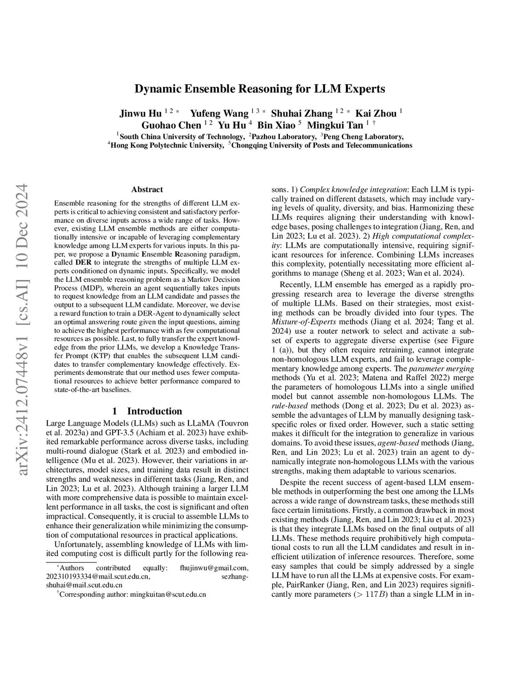 LLMs have demonstrated impressive performance across various language tasks. However, the strengths of LLMs can vary due to different architectures, model sizes, areas of training data, etc. Therefore, ensemble reasoning for the strengths of different LLM experts is critical to achieving consistent and satisfactory performance on diverse inputs across a wide range of tasks. However, existing LLM ensemble methods are either computationally intensive or incapable of leveraging complementary knowledge among LLM experts for various inputs. In this paper, we propose an efficient Dynamic Ensemble Reasoning paradigm, called DER to integrate the strengths of multiple LLM experts conditioned on dynamic inputs. Specifically, we model the LLM ensemble reasoning problem as a Markov Decision Process, wherein an agent sequentially takes inputs to request knowledge from an LLM candidate and passes the output to a subsequent LLM candidate. Moreover, we devise a reward function to train a DER-Agent to dynamically select an optimal answering route given the input questions, aiming to achieve the highest performance with as few computational resources as possible. Last, to fully transfer the expert knowledge from the prior LLMs, we develop a Knowledge Transfer Prompt that enables the subsequent LLM candidates to transfer complementary knowledge effectively. Experiments demonstrate that our method uses fewer computational resources to achieve better performance compared to state-of-the-art baselines. Code and appendix are available atthis https URL