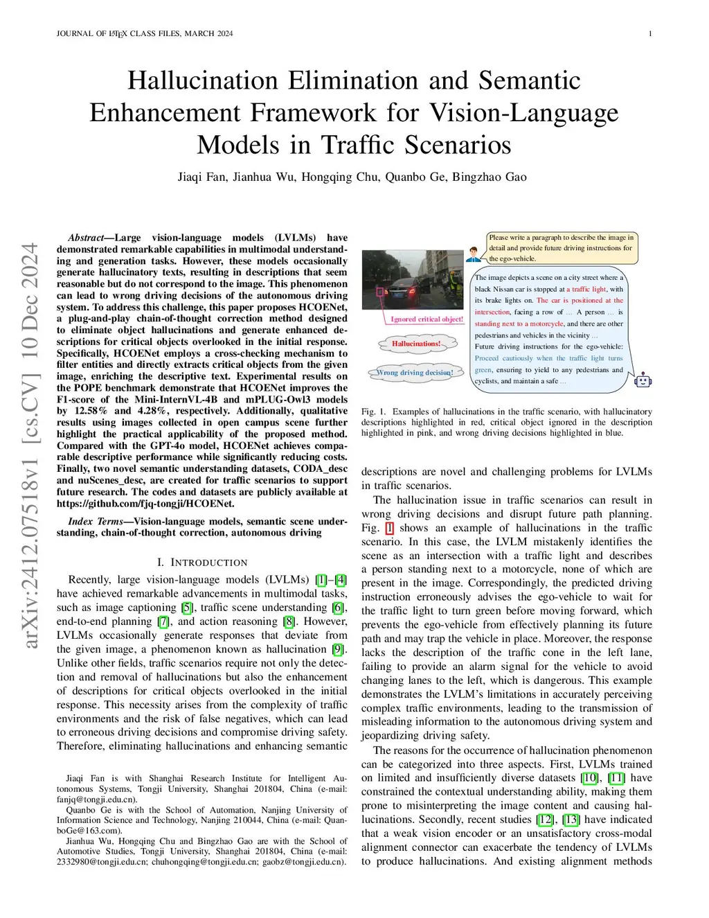 Large vision-language models (LVLMs) have demonstrated remarkable capabilities in multimodal understanding and generation tasks. However, these models occasionally generate hallucinatory texts, resulting in descriptions that seem reasonable but do not correspond to the image. This phenomenon can lead to wrong driving decisions of the autonomous driving system. To address this challenge, this paper proposes HCOENet, a plug-and-play chain-of-thought correction method designed to eliminate object hallucinations and generate enhanced descriptions for critical objects overlooked in the initial response. Specifically, HCOENet employs a cross-checking mechanism to filter entities and directly extracts critical objects from the given image, enriching the descriptive text. Experimental results on the POPE benchmark demonstrate that HCOENet improves the F1-score of the Mini-InternVL-4B and mPLUG-Owl3 models by 12.58% and 4.28%, respectively. Additionally, qualitative results using images collected in open campus scene further highlight the practical applicability of the proposed method. Compared with the GPT-4o model, HCOENet achieves comparable descriptive performance while significantly reducing costs. Finally, two novel semantic understanding datasets, CODA_desc and nuScenes_desc, are created for traffic scenarios to support future research. The codes and datasets are publicly available at https://github.com/fjq-tongji/HCOENet.