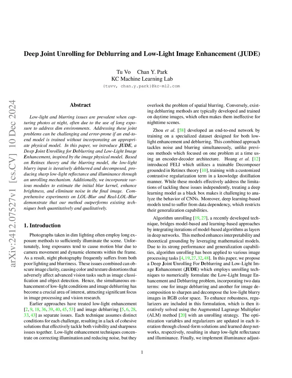 Low-light and blurring issues are prevalent when capturing photos at night, often due to the use of long exposure to address dim environments. Addressing these joint problems can be challenging and error-prone if an end-to-end model is trained without incorporating an appropriate physical model. In this paper, we introduce JUDE, a Deep Joint Unrolling for Deblurring and Low-Light Image Enhancement, inspired by the image physical model. Based on Retinex theory and the blurring model, the low-light blurry input is iteratively deblurred and decomposed, producing sharp low-light reflectance and illuminance through an unrolling mechanism. Additionally, we incorporate various modules to estimate the initial blur kernel, enhance brightness, and eliminate noise in the final image. Comprehensive experiments on LOL-Blur and Real-LOL-Blur demonstrate that our method outperforms existing techniques both quantitatively and qualitatively.