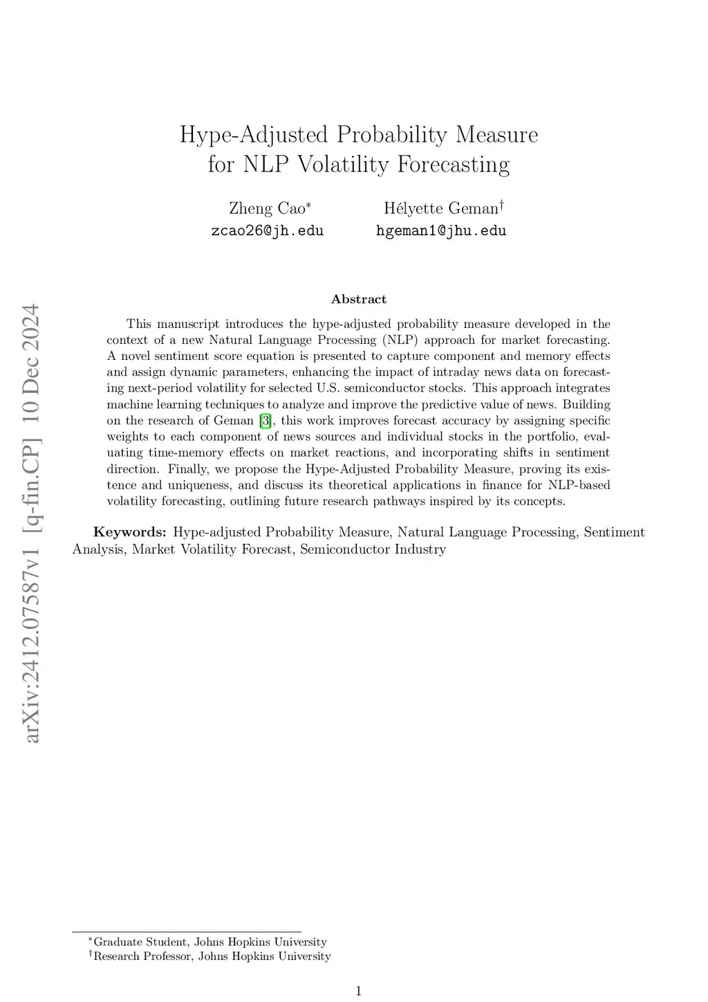 This article introduces a Hype-Adjusted Probability Measure in the context of a new Natural Language Processing (NLP) approach for stock return and volatility forecasting. A novel sentiment score equation is proposed to represent the impact of intraday news on forecasting next-period stock return and volatility for selected U.S. semiconductor tickers, a very vibrant industry sector. This work improves the forecast accuracy by addressing news bias, memory, and weight, and incorporating shifts in sentiment direction. More importantly, it extends the use of the remarkable tool of change of Probability Measure developed in the finance of Asset Pricing to NLP forecasting by constructing a Hype-Adjusted Probability Measure, obtained from a redistribution of the weights in the probability space, meant to correct for excessive or insufficient news.