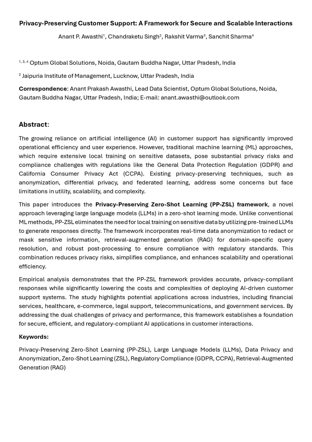 The growing reliance on artificial intelligence (AI) in customer support has significantly improved operational efficiency and user experience. However, traditional machine learning (ML) approaches, which require extensive local training on sensitive datasets, pose substantial privacy risks and compliance challenges with regulations like the General Data Protection Regulation (GDPR) and California Consumer Privacy Act (CCPA). Existing privacy-preserving techniques, such as anonymization, differential privacy, and federated learning, address some concerns but face limitations in utility, scalability, and complexity. This paper introduces the Privacy-Preserving Zero-Shot Learning (PP-ZSL) framework, a novel approach leveraging large language models (LLMs) in a zero-shot learning mode. Unlike conventional ML methods, PP-ZSL eliminates the need for local training on sensitive data by utilizing pre-trained LLMs to generate responses directly. The framework incorporates real-time data anonymization to redact or mask sensitive information, retrieval-augmented generation (RAG) for domain-specific query resolution, and robust post-processing to ensure compliance with regulatory standards. This combination reduces privacy risks, simplifies compliance, and enhances scalability and operational efficiency. Empirical analysis demonstrates that the PP-ZSL framework provides accurate, privacy-compliant responses while significantly lowering the costs and complexities of deploying AI-driven customer support systems. The study highlights potential applications across industries, including financial services, healthcare, e-commerce, legal support, telecommunications, and government services. By addressing the dual challenges of privacy and performance, this framework establishes a foundation for secure, efficient, and regulatory-compliant AI applications in customer interactions.