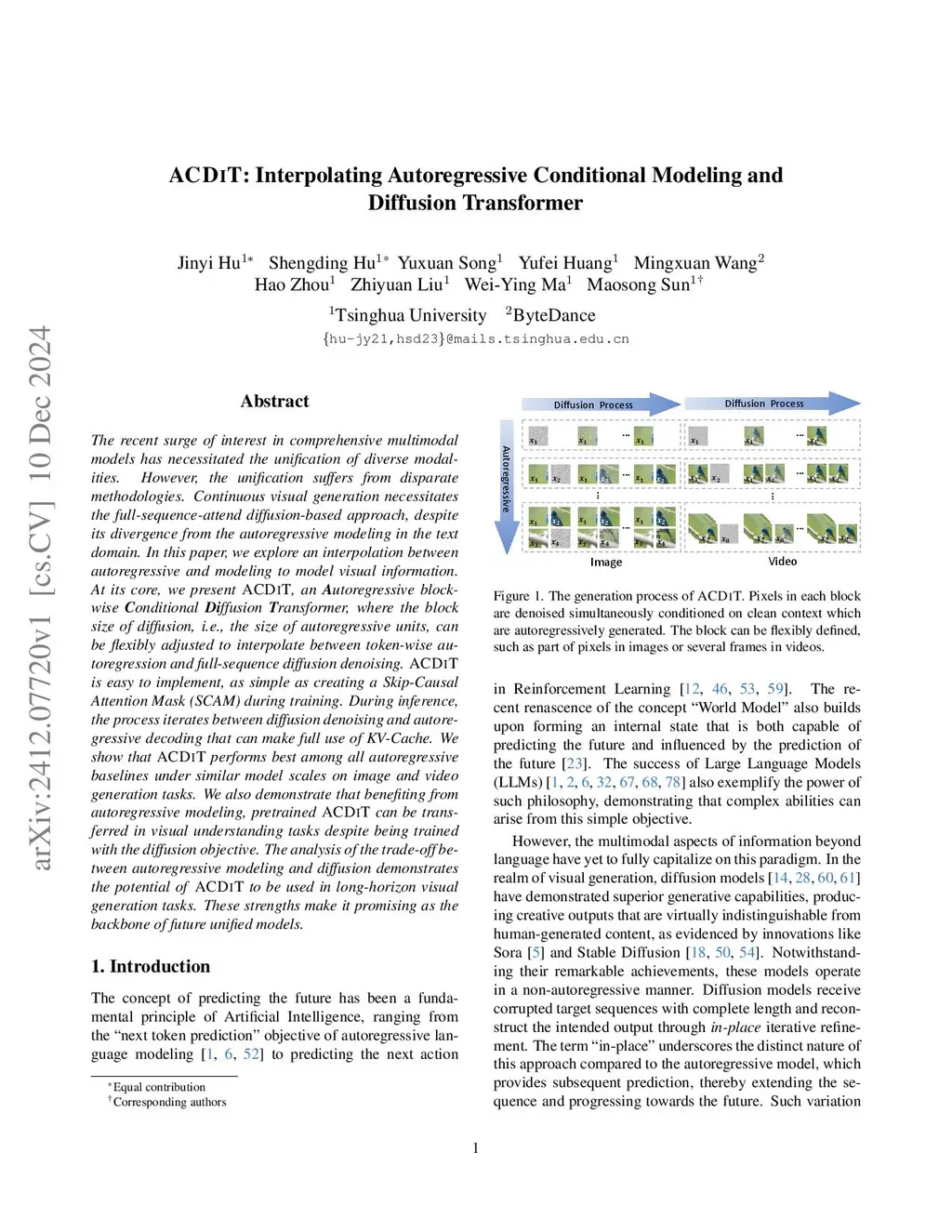Autoregressive and diffusion models have achieved remarkable progress in language models and visual generation, respectively. We present ACDiT, a novel Autoregressive blockwise Conditional Diffusion Transformer, that innovatively combines autoregressive and diffusion paradigms for continuous visual information. By introducing a block-wise autoregressive unit, ACDiT offers a flexible interpolation between token-wise autoregression and full-sequence diffusion, bypassing the limitations of discrete tokenization. The generation of each block is formulated as a conditional diffusion process, conditioned on prior blocks. ACDiT is easy to implement, as simple as applying a specially designed Skip-Causal Attention Mask on the standard diffusion transformer during training. During inference, the process iterates between diffusion denoising and autoregressive decoding that can make full use of KV-Cache. We validate the effectiveness of ACDiT on image, video, and text generation and show that ACDiT performs best among all autoregressive baselines under similar model scales on visual generation tasks. We also demonstrate that, benefiting from autoregressive modeling, pretrained ACDiT can be transferred in visual understanding tasks despite being trained with the generative objective. The analysis of the trade-off between autoregressive and diffusion demonstrates the potential of ACDiT to be used in long-horizon visual generation tasks. We hope that ACDiT offers a novel perspective on visual autoregressive generation and sheds light on new avenues for unified models.