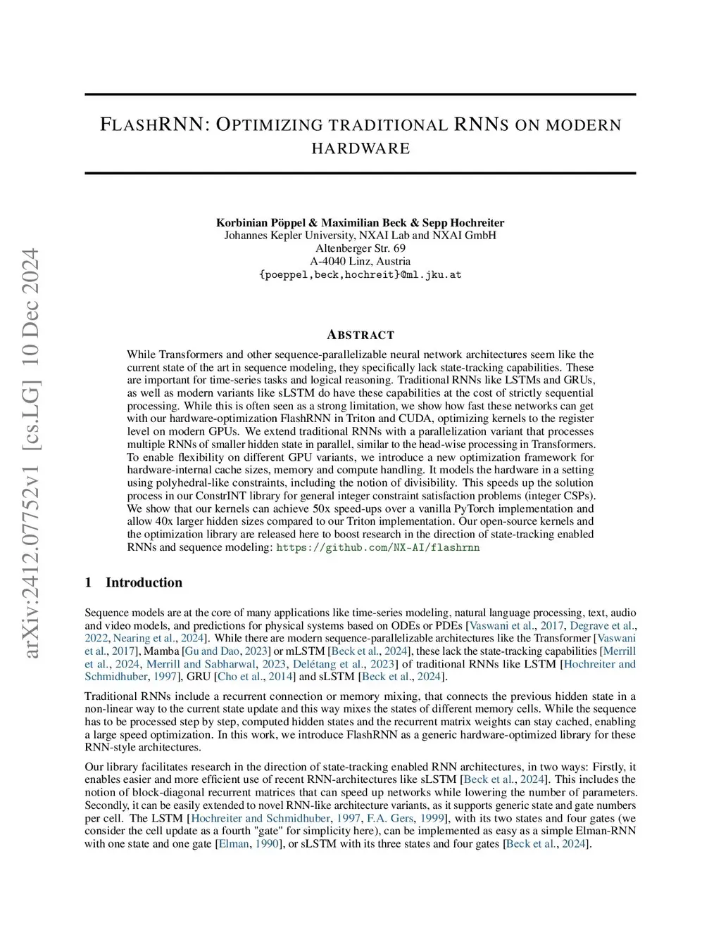While Transformers and other sequence-parallelizable neural network architectures seem like the current state of the art in sequence modeling, they specifically lack state-tracking capabilities. These are important for time-series tasks and logical reasoning. Traditional RNNs like LSTMs and GRUs, as well as modern variants like sLSTM do have these capabilities at the cost of strictly sequential processing. While this is often seen as a strong limitation, we show how fast these networks can get with our hardware-optimization FlashRNN in Triton and CUDA, optimizing kernels to the register level on modern GPUs. We extend traditional RNNs with a parallelization variant that processes multiple RNNs of smaller hidden state in parallel, similar to the head-wise processing in Transformers. To enable flexibility on different GPU variants, we introduce a new optimization framework for hardware-internal cache sizes, memory and compute handling. It models the hardware in a setting using polyhedral-like constraints, including the notion of divisibility. This speeds up the solution process in our ConstrINT library for general integer constraint satisfaction problems (integer CSPs). We show that our kernels can achieve 50x speed-ups over a vanilla PyTorch implementation and allow 40x larger hidden sizes compared to our Triton implementation. Our open-source kernels and the optimization library are released here to boost research in the direction of state-tracking enabled RNNs and sequence modeling:this https URL