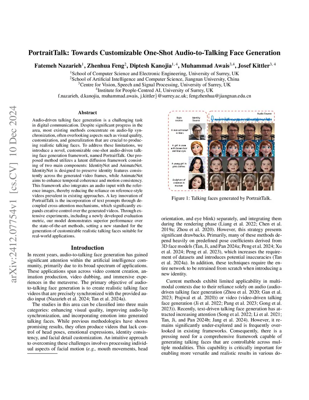 Audio-driven talking face generation is a challenging task in digital communication. Despite significant progress in the area, most existing methods concentrate on audio-lip synchronization, often overlooking aspects such as visual quality, customization, and generalization that are crucial to producing realistic talking faces. To address these limitations, we introduce a novel, customizable one-shot audio-driven talking face generation framework, named PortraitTalk. Our proposed method utilizes a latent diffusion framework consisting of two main components: IdentityNet and AnimateNet. IdentityNet is designed to preserve identity features consistently across the generated video frames, while AnimateNet aims to enhance temporal coherence and motion consistency. This framework also integrates an audio input with the reference images, thereby reducing the reliance on reference-style videos prevalent in existing approaches. A key innovation of PortraitTalk is the incorporation of text prompts through decoupled cross-attention mechanisms, which significantly expands creative control over the generated videos. Through extensive experiments, including a newly developed evaluation metric, our model demonstrates superior performance over the state-of-the-art methods, setting a new standard for the generation of customizable realistic talking faces suitable for real-world applications.