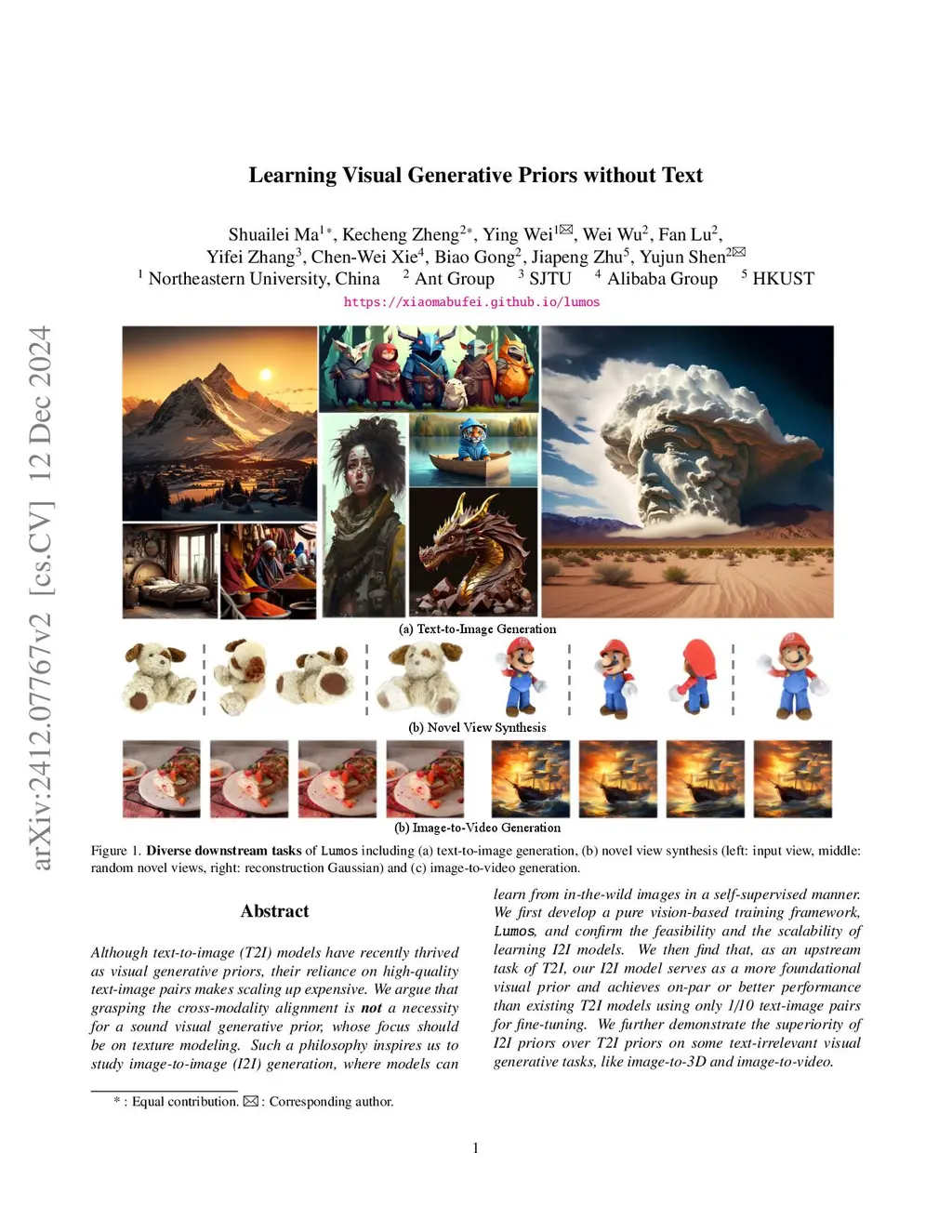 Although text-to-image (T2I) models have recently thrived as visual generative priors, their reliance on high-quality text-image pairs makes scaling up expensive. We argue that grasping the cross-modality alignment is not a necessity for a sound visual generative prior, whose focus should be on texture modeling. Such a philosophy inspires us to study image-to-image (I2I) generation, where models can learn from in-the-wild images in a self-supervised manner. We first develop a pure vision-based training framework, Lumos, and confirm the feasibility and the scalability of learning I2I models. We then find that, as an upstream task of T2I, our I2I model serves as a more foundational visual prior and achieves on-par or better performance than existing T2I models using only 1/10 text-image pairs for fine-tuning. We further demonstrate the superiority of I2I priors over T2I priors on some text-irrelevant visual generative tasks, like image-to-3D and image-to-video. Our project page is available atthis https URL.