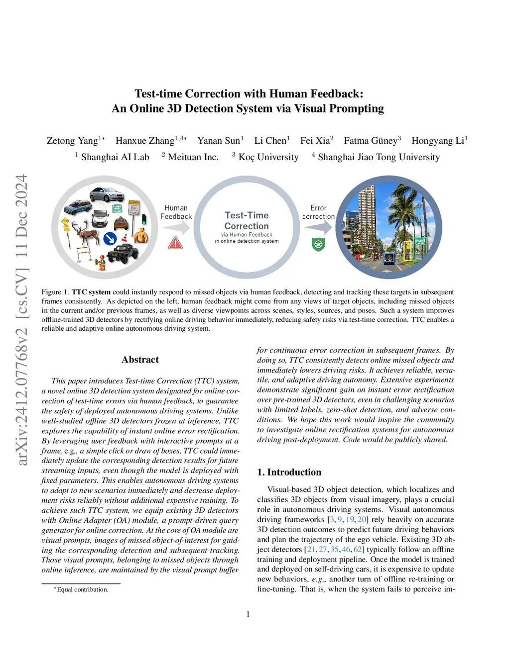This paper introduces Test-time Correction (TTC), an online 3D detection system designed to rectify test-time errors using various auxiliary feedback, aiming to enhance the safety of deployed autonomous driving systems. Unlike conventional offline 3D detectors that remain fixed during inference, TTC enables immediate online error correction without retraining, allowing autonomous vehicles to adapt to new scenarios and reduce deployment risks. To achieve this, we equip existing 3D detectors with an Online Adapter (OA) module -- a prompt-driven query generator for real-time correction. At the core of OA module are visual prompts: image-based descriptions of objects of interest derived from auxiliary feedback such as mismatches with 2D detections, road descriptions, or user clicks. These visual prompts, collected from risky objects during inference, are maintained in a visual prompt buffer to enable continuous correction in future frames. By leveraging this mechanism, TTC consistently detects risky objects, achieving reliable, adaptive, and versatile driving autonomy. Extensive experiments show that TTC significantly improves instant error rectification over frozen 3D detectors, even under limited labels, zero-shot settings, and adverse conditions. We hope this work inspires future research on post-deployment online rectification systems for autonomous driving.