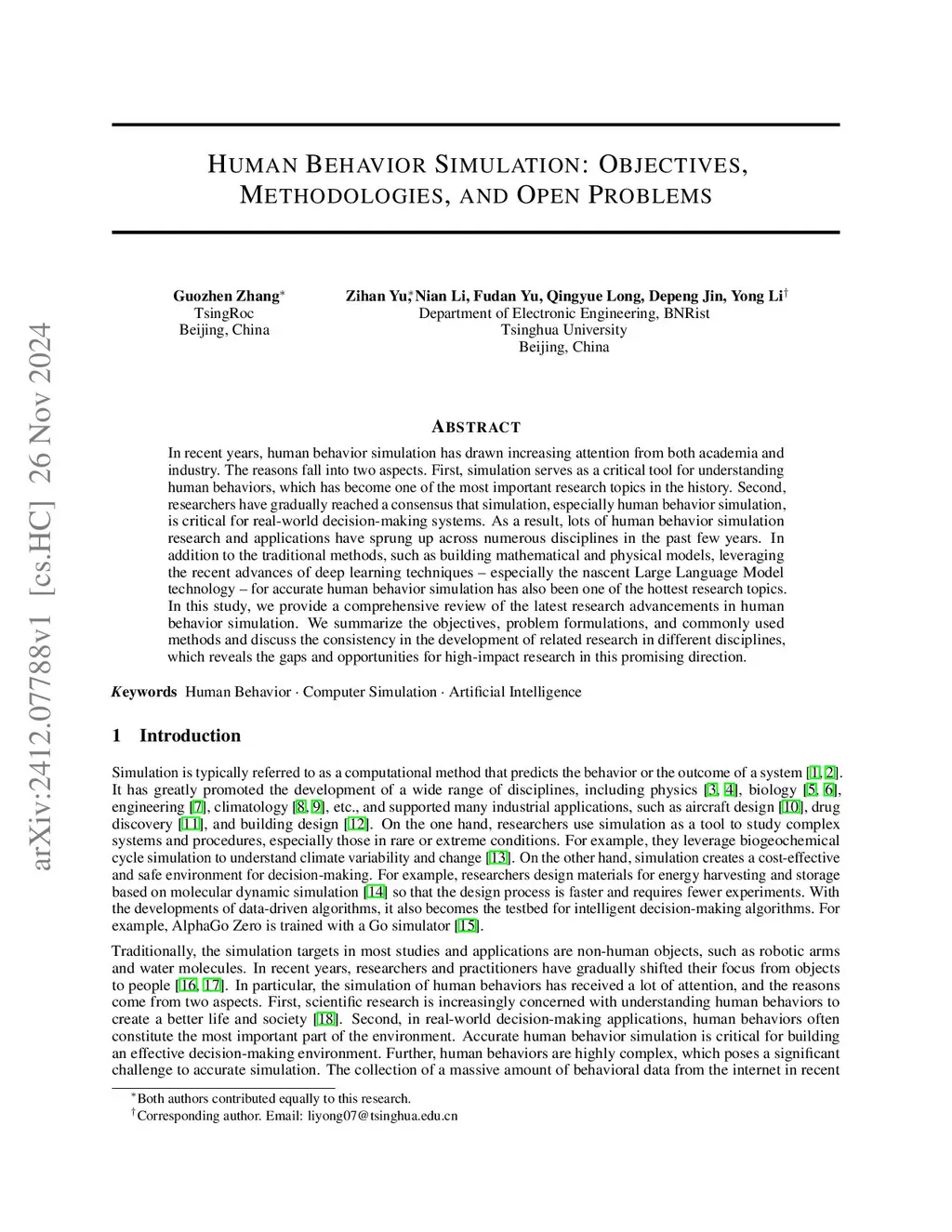 Human Behavior Simulation: Objectives, Methodologies, and Open Problems