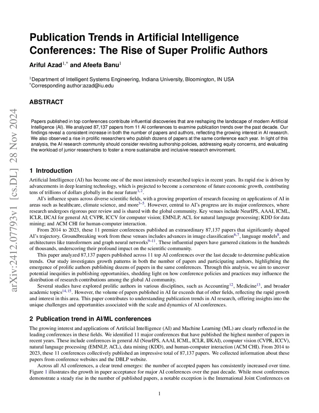 Papers published in top conferences contribute influential discoveries that are reshaping the landscape of modern Artificial Intelligence (AI). We analyzed 87,137 papers from 11 AI conferences to examine publication trends over the past decade. Our findings reveal a consistent increase in both the number of papers and authors, reflecting the growing interest in AI research. We also observed a rise in prolific researchers who publish dozens of papers at the same conference each year. In light of this analysis, the AI research community should consider revisiting authorship policies, addressing equity concerns, and evaluating the workload of junior researchers to foster a more sustainable and inclusive research environment.