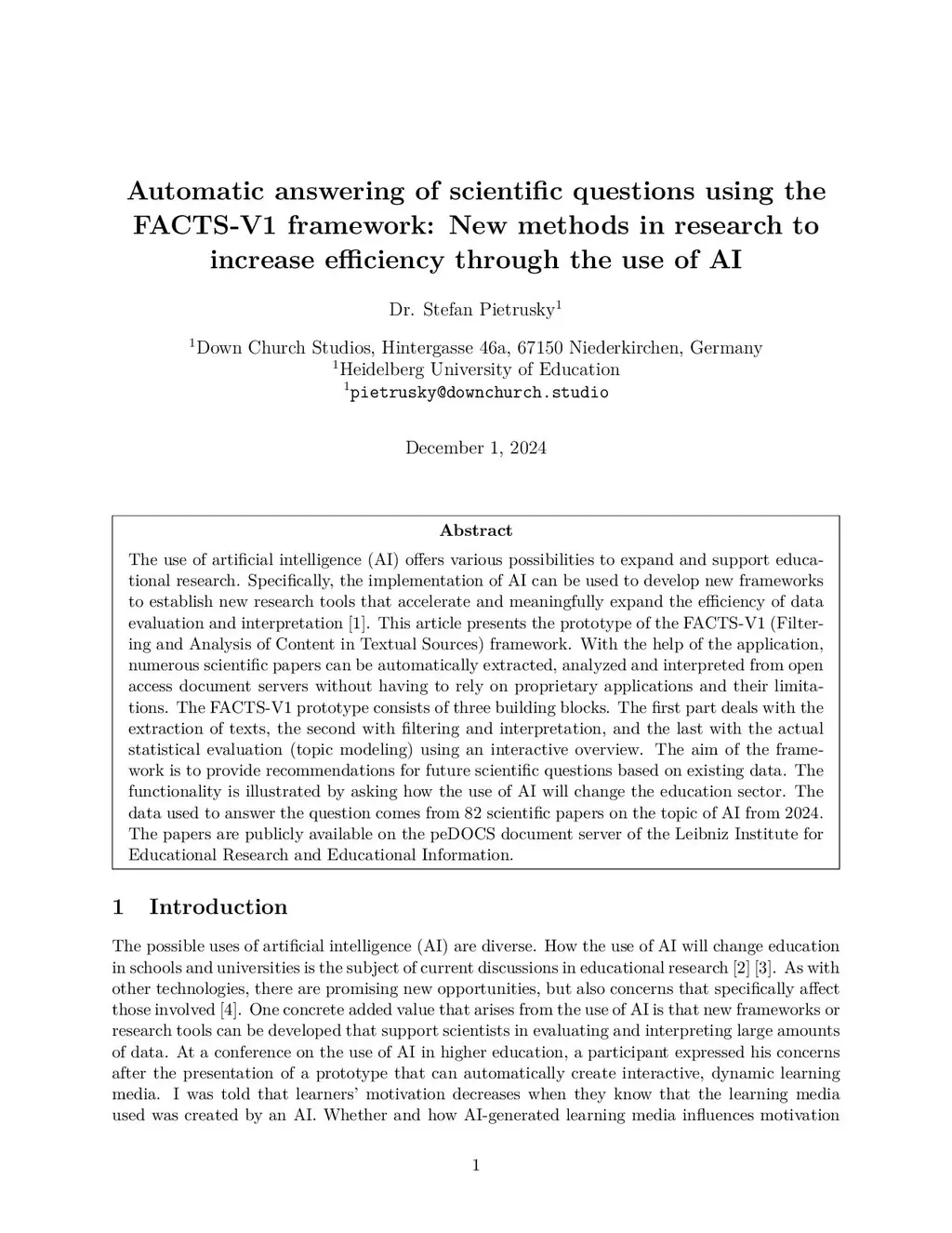 The use of artificial intelligence (AI) offers various possibilities to expand and support educational research. Specifically, the implementation of AI can be used to develop new frameworks to establish new research tools that accelerate and meaningfully expand the efficiency of data evaluation and interpretation (Buckingham Shum et al., 2023). This article presents the prototype of the FACTS-V1 (Filtering and Analysis of Content in Textual Sources) framework. With the help of the application, numerous scientific papers can be automatically extracted, analyzed and interpreted from open access document servers without having to rely on proprietary applications and their limitations. The FACTS-V1 prototype consists of three building blocks. The first part deals with the extraction of texts, the second with filtering and interpretation, and the last with the actual statistical evaluation (topic modeling) using an interactive overview. The aim of the framework is to provide recommendations for future scientific questions based on existing data. The functionality is illustrated by asking how the use of AI will change the education sector. The data used to answer the question comes from 82 scientific papers on the topic of AI from 2024. The papers are publicly available on the peDOCS document server of the Leibniz Institute for Educational Research and Educational Information.