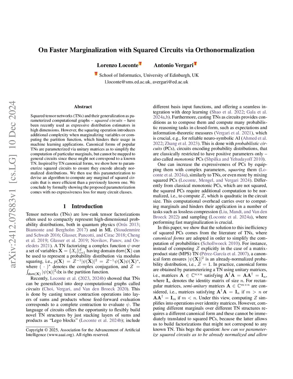 Squared tensor networks (TNs) and their generalization as parameterized computational graphs -- squared circuits -- have been recently used as expressive distribution estimators in high dimensions. However, the squaring operation introduces additional complexity when marginalizing variables or computing the partition function, which hinders their usage in machine learning applications. Canonical forms of popular TNs are parameterized via unitary matrices as to simplify the computation of particular marginals, but cannot be mapped to general circuits since these might not correspond to a known TN. Inspired by TN canonical forms, we show how to parameterize squared circuits to ensure they encode already normalized distributions. We then use this parameterization to devise an algorithm to compute any marginal of squared circuits that is more efficient than a previously known one. We conclude by formally showing the proposed parameterization comes with no expressiveness loss for many circuit classes.