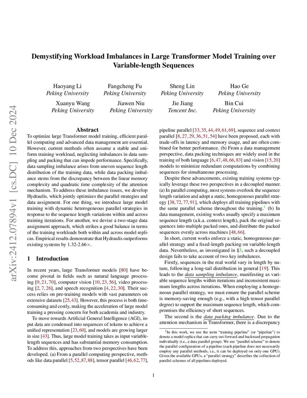 To optimize large Transformer model training, both efficient parallel computing and advanced data management are indispensable. However, current methods often assume a stable and uniform training workload, neglecting data-induced imbalances-arising from both sampling and packing processes-which can impede training performance. Specifically, data sampling imbalance arises from uneven sequence length distribution of the training data, while data packing imbalance stems from the discrepancy between the linear memory complexity and quadratic time complexity of the attention mechanism. To address these imbalance issues, we develop Hydraulis, which jointly optimizes the parallel strategies and data assignment. For one thing, we introduce large model training with dynamic heterogeneous parallel strategies in response to the sequence length variations within and across training iterations. For another, we devise a two-stage data assignment approach, which strikes a good balance in terms of the training workloads both within and across model replicas. Empirical results demonstrate that Hydraulis outperforms existing systems by 1.32-2.66 times.