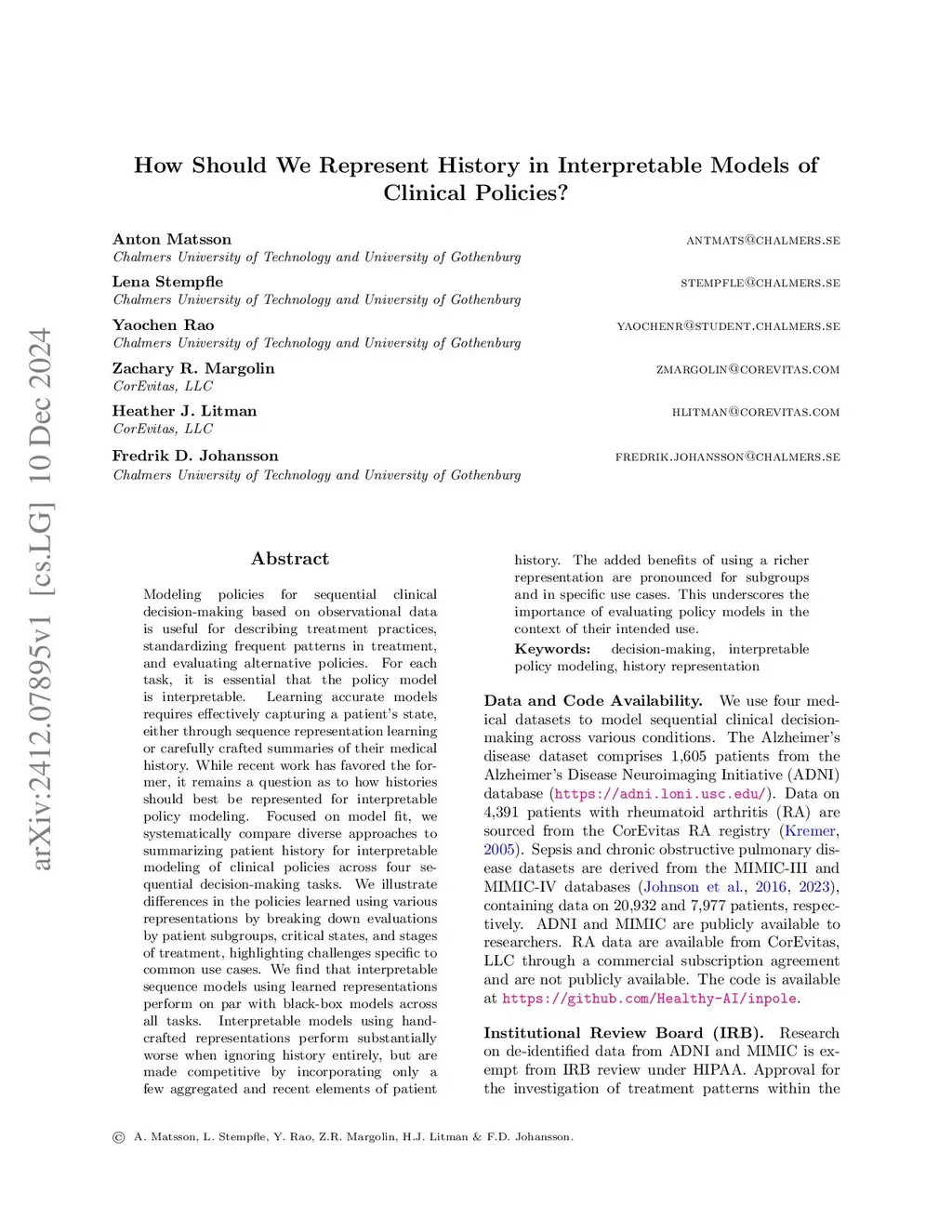 Modeling policies for sequential clinical decision-making based on observational data is useful for describing treatment practices, standardizing frequent patterns in treatment, and evaluating alternative policies. For each task, it is essential that the policy model is interpretable. Learning accurate models requires effectively capturing the state of a patient, either through sequence representation learning or carefully crafted summaries of their medical history. While recent work has favored the former, it remains a question as to how histories should best be represented for interpretable policy modeling. Focused on model fit, we systematically compare diverse approaches to summarizing patient history for interpretable modeling of clinical policies across four sequential decision-making tasks. We illustrate differences in the policies learned using various representations by breaking down evaluations by patient subgroups, critical states, and stages of treatment, highlighting challenges specific to common use cases. We find that interpretable sequence models using learned representations perform on par with black-box models across all tasks. Interpretable models using hand-crafted representations perform substantially worse when ignoring history entirely, but are made competitive by incorporating only a few aggregated and recent elements of patient history. The added benefits of using a richer representation are pronounced for subgroups and in specific use cases. This underscores the importance of evaluating policy models in the context of their intended use.