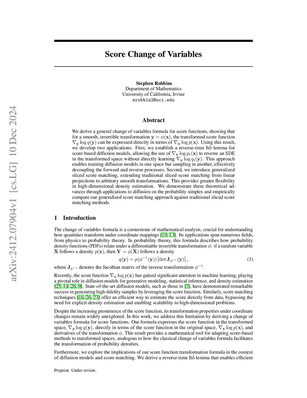 We derive a general change of variables formula for score functions, showing that for a smooth, invertible transformation , the transformed score function can be expressed directly in terms of . Using this result, we develop two applications: First, we establish a reverse-time Itô lemma for score-based diffusion models, allowing the use of to reverse an SDE in the transformed space without directly learning . This approach enables training diffusion models in one space but sampling in another, effectively decoupling the forward and reverse processes. Second, we introduce generalized sliced score matching, extending traditional sliced score matching from linear projections to arbitrary smooth transformations. This provides greater flexibility in high-dimensional density estimation. We demonstrate these theoretical advances through applications to diffusion on the probability simplex and empirically compare our generalized score matching approach against traditional sliced score matching methods.