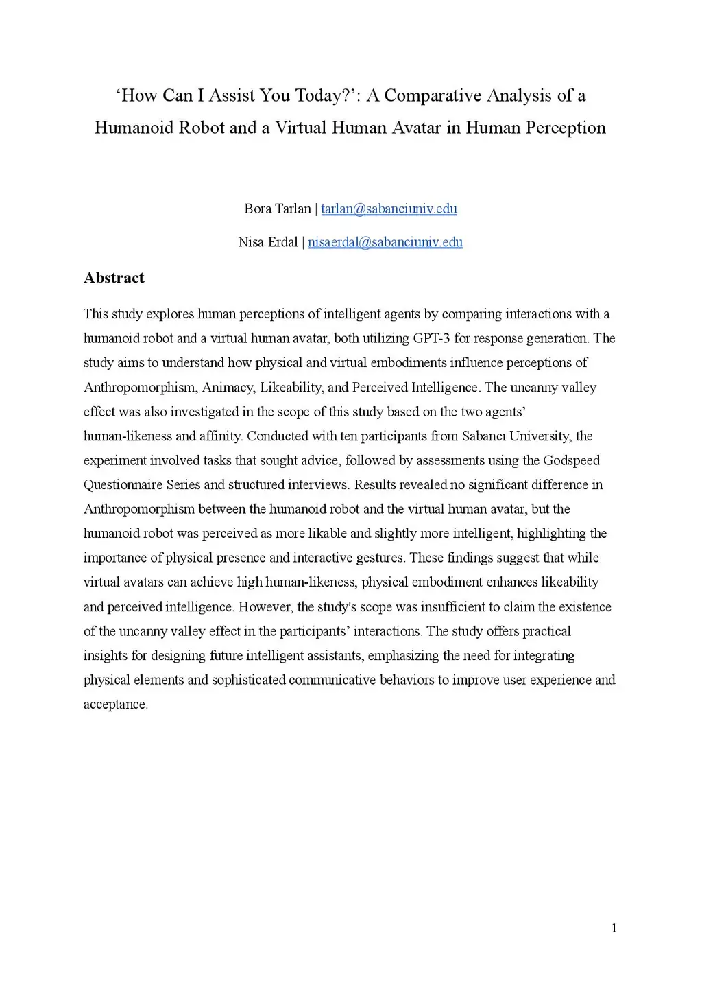 This study explores human perceptions of intelligent agents by comparing interactions with a humanoid robot and a virtual human avatar, both utilizing GPT-3 for response generation. The study aims to understand how physical and virtual embodiments influence perceptions of anthropomorphism, animacy, likeability, and perceived intelligence. The uncanny valley effect was also investigated in the scope of this study based on the two agents' human-likeness and affinity. Conducted with ten participants from Sabanci University, the experiment involved tasks that sought advice, followed by assessments using the Godspeed Questionnaire Series and structured interviews. Results revealed no significant difference in anthropomorphism between the humanoid robot and the virtual human avatar, but the humanoid robot was perceived as more likable and slightly more intelligent, highlighting the importance of physical presence and interactive gestures. These findings suggest that while virtual avatars can achieve high human-likeness, physical embodiment enhances likeability and perceived intelligence. However, the study's scope was insufficient to claim the existence of the uncanny valley effect in the participants' interactions. The study offers practical insights for designing future intelligent assistants, emphasizing the need for integrating physical elements and sophisticated communicative behaviors to improve user experience and acceptance.