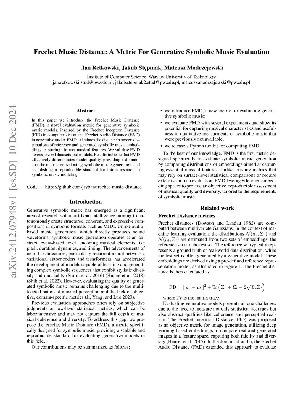 In this paper we introduce the Frechet Music Distance (FMD), a novel evaluation metric for generative symbolic music models, inspired by the Frechet Inception Distance (FID) in computer vision and Frechet Audio Distance (FAD) in generative audio. FMD calculates the distance between distributions of reference and generated symbolic music embeddings, capturing abstract musical features. We validate FMD across several datasets and models. Results indicate that FMD effectively differentiates model quality, providing a domain-specific metric for evaluating symbolic music generation, and establishing a reproducible standard for future research in symbolic music modeling.