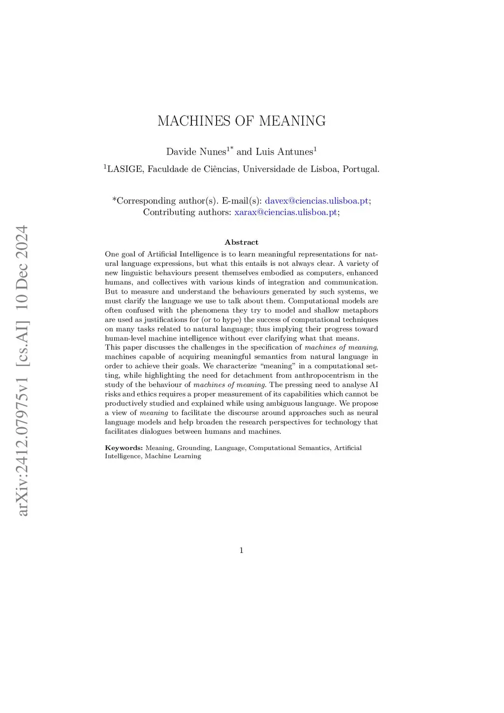 One goal of Artificial Intelligence is to learn meaningful representations for natural language expressions, but what this entails is not always clear. A variety of new linguistic behaviours present themselves embodied as computers, enhanced humans, and collectives with various kinds of integration and communication. But to measure and understand the behaviours generated by such systems, we must clarify the language we use to talk about them. Computational models are often confused with the phenomena they try to model and shallow metaphors are used as justifications for (or to hype) the success of computational techniques on many tasks related to natural language; thus implying their progress toward human-level machine intelligence without ever clarifying what that means. This paper discusses the challenges in the specification of "machines of meaning", machines capable of acquiring meaningful semantics from natural language in order to achieve their goals. We characterize "meaning" in a computational setting, while highlighting the need for detachment from anthropocentrism in the study of the behaviour of machines of meaning. The pressing need to analyse AI risks and ethics requires a proper measurement of its capabilities which cannot be productively studied and explained while using ambiguous language. We propose a view of "meaning" to facilitate the discourse around approaches such as neural language models and help broaden the research perspectives for technology that facilitates dialogues between humans and machines.