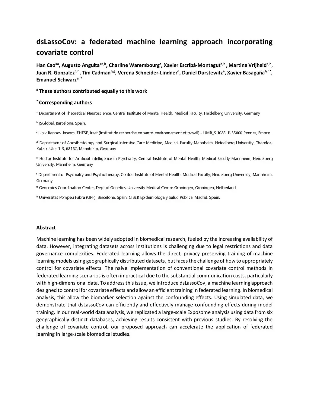 Machine learning has been widely adopted in biomedical research, fueled by the increasing availability of data. However, integrating datasets across institutions is challenging due to legal restrictions and data governance complexities. Federated learning allows the direct, privacy preserving training of machine learning models using geographically distributed datasets, but faces the challenge of how to appropriately control for covariate effects. The naive implementation of conventional covariate control methods in federated learning scenarios is often impractical due to the substantial communication costs, particularly with high-dimensional data. To address this issue, we introduce dsLassoCov, a machine learning approach designed to control for covariate effects and allow an efficient training in federated learning. In biomedical analysis, this allow the biomarker selection against the confounding effects. Using simulated data, we demonstrate that dsLassoCov can efficiently and effectively manage confounding effects during model training. In our real-world data analysis, we replicated a large-scale Exposome analysis using data from six geographically distinct databases, achieving results consistent with previous studies. By resolving the challenge of covariate control, our proposed approach can accelerate the application of federated learning in large-scale biomedical studies.