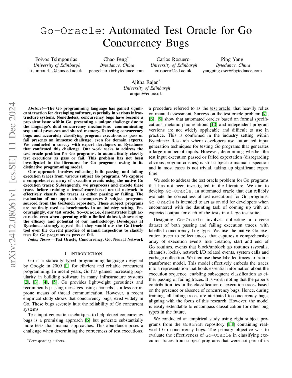 The Go programming language has gained significant traction for developing software, especially in various infrastructure systems. Nonetheless, concurrency bugs have become a prevalent issue within Go, presenting a unique challenge due to the language's dual concurrency mechanisms-communicating sequential processes and shared memory. Detecting concurrency bugs and accurately classifying program executions as pass or fail presents an immense challenge, even for domain experts. We conducted a survey with expert developers at Bytedance that confirmed this challenge. Our work seeks to address the test oracle problem for Go programs, to automatically classify test executions as pass or fail. This problem has not been investigated in the literature for Go programs owing to its distinctive programming model. Our approach involves collecting both passing and failing execution traces from various subject Go programs. We capture a comprehensive array of execution events using the native Go execution tracer. Subsequently, we preprocess and encode these traces before training a transformer-based neural network to effectively classify the traces as either passing or failing. The evaluation of our approach encompasses 8 subject programs sourced from the GoBench repository. These subject programs are routinely used as benchmarks in an industry setting. Encouragingly, our test oracle, Go-Oracle, demonstrates high accuracies even when operating with a limited dataset, showcasing the efficacy and potential of our methodology. Developers at Bytedance strongly agreed that they would use the Go-Oracle tool over the current practice of manual inspections to classify tests for Go programs as pass or fail.